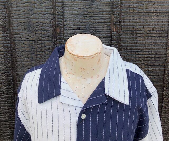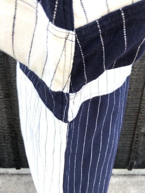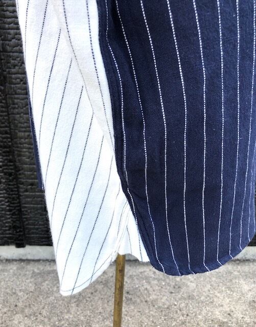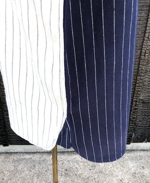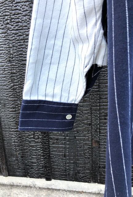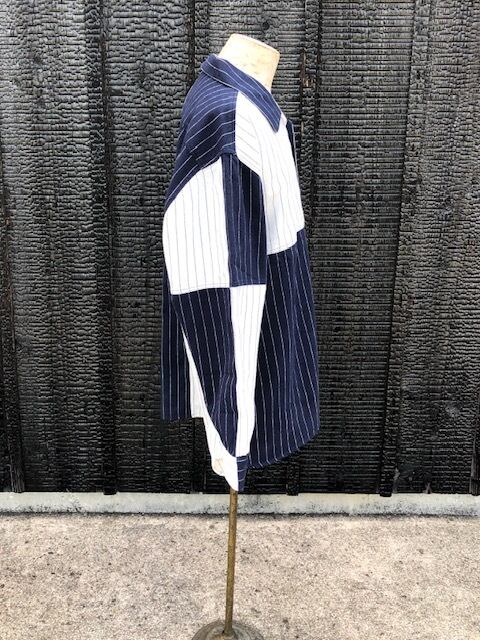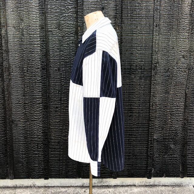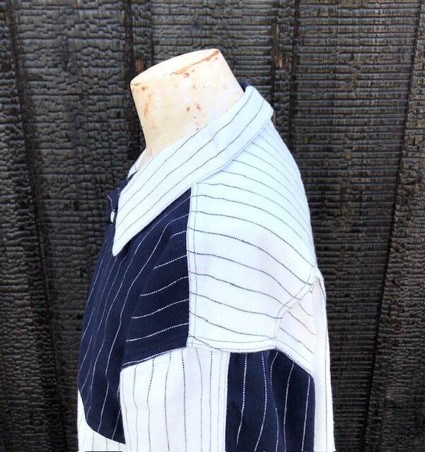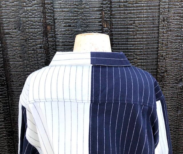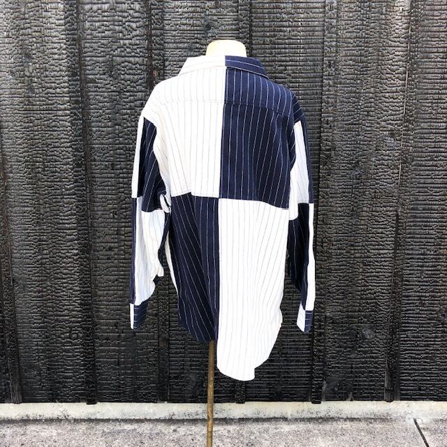 このオーバーサイズなプルオーバーシャツは二種類の対照的なストライプコットンオックスフォード生地で作られており、切り返しのデザインによってチェッカーボード柄になっています。
