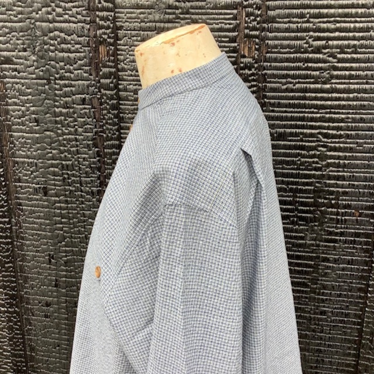 ともかくも生地のブルーチェックの織り目が美しい、しゃりっとした生地。