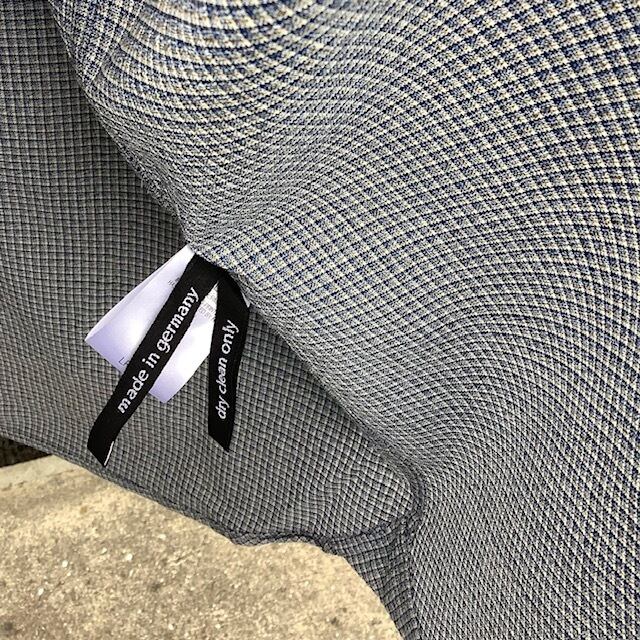 ウィーンで約50年仕立て屋として開業していた老ユダヤ人のオーナーから買い取った生地を使用。それら希少な生地を使ったアイテムには別のタグが付いています。「Sütterlin 」と呼ばれる、非常に古いドイツの手書き文字のタグで す。今では誰も読めないが、1930年代まではドイツでは小学生なら誰でもが習ったフォントだそうです。タグにはこう書かれています「Deutsche Schneiderkunst」....訳は「the german art of tailoringドイツの仕立ての芸術」