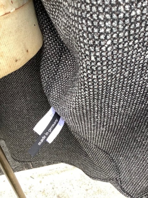 ウィーンで約50年仕立て屋として開業していた老ユダヤ人のオーナーから買い取った生地を使用。それら希少な生地を使ったアイテムには別のタグが付いています。「Sütterlin 」と呼ばれる、非常に古いドイツの手書き文字のタグで す。今では誰も読めないが、1930年代まではドイツでは小学生なら誰でもが習ったフォントだそうです。タグにはこう書かれています「Deutsche Schneiderkunst」....訳は「the german art of tailoringドイツの仕立ての芸術」