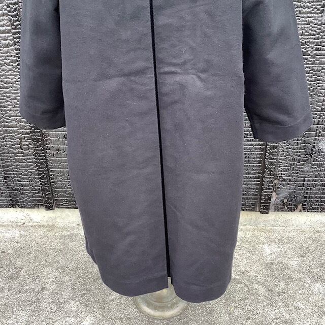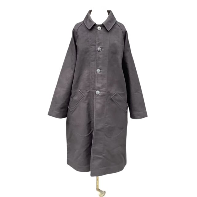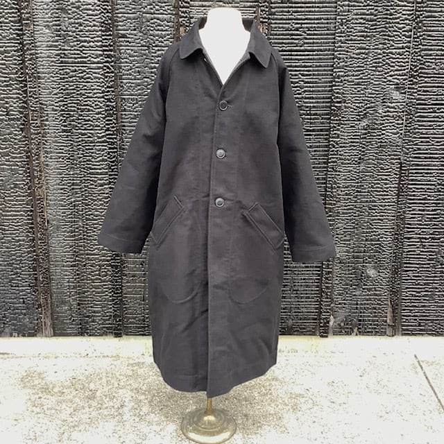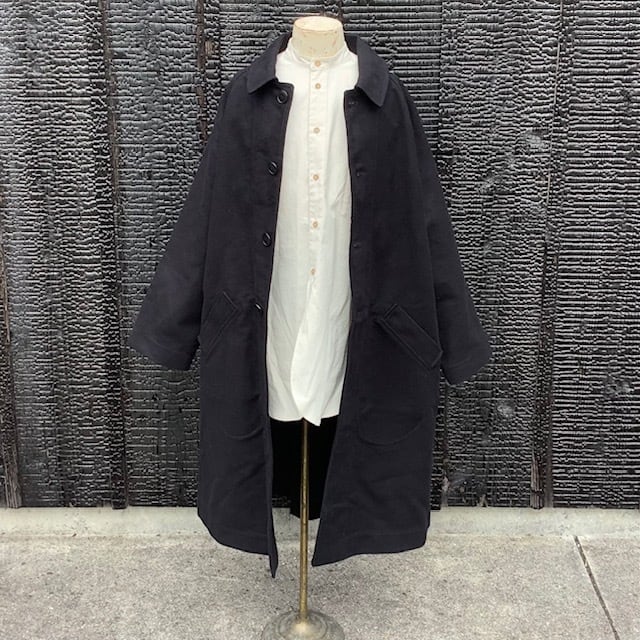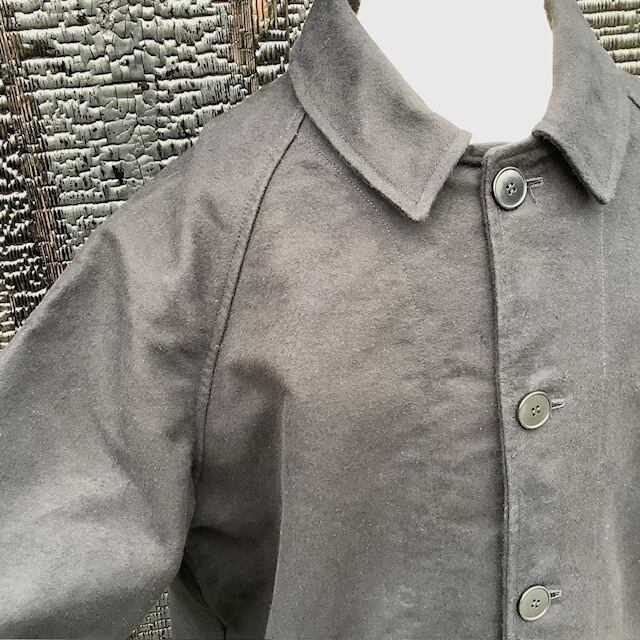 旧式の織機の廃棄と工場閉鎖によりジャーマンレザーの生地が作れなくなったことで一時生産を休止していましたが、 かなりの要望があり、なんとか期待にこたえるためにデザイナーが探しまわり、とうとう作り上げた生地がこのジャーマンレザーです。 ドイツ国内のファクトリーで、また、今できる限りの状況下で織り上げた生地は、これまでのものと同じとは言えませんが、充分に高密度の織りが出来上がり、自信をもって紹介しています。 こちらのバルマカーンタイプのコートはラグランスリーブであり、バックスタイルの背中の上部にまで入る深めのインバーテッドプリーツにより動きやすく、また、たっぷりとした身頃と袖は重ね着にも重宝します。革のように柔らかくなるジャーマンレザーは、長く、このアイテムを育てて、アタリや色落ちに至るまで楽しんでください。