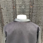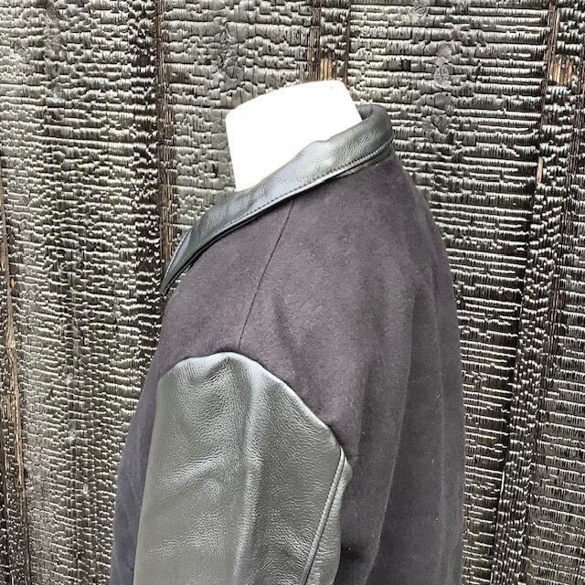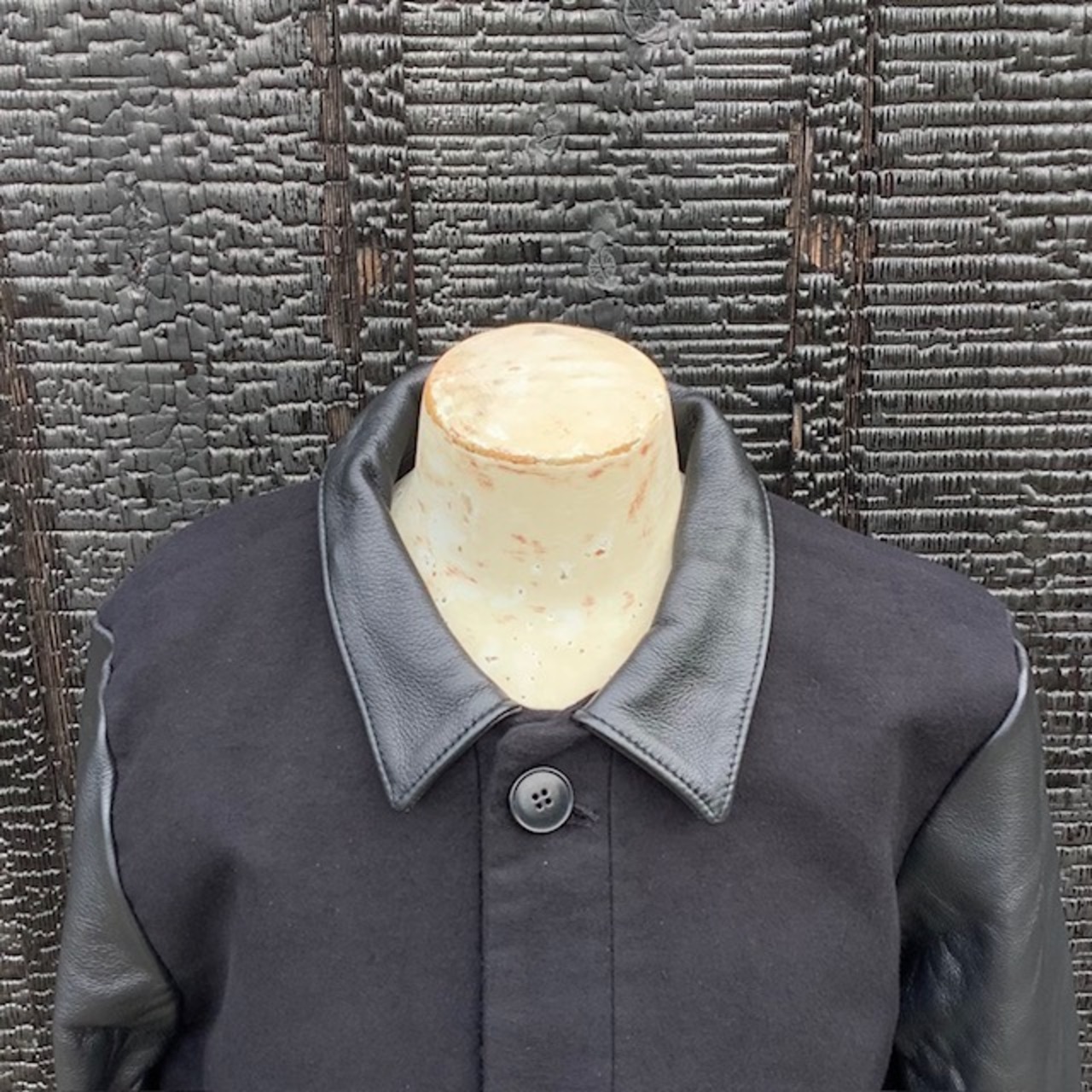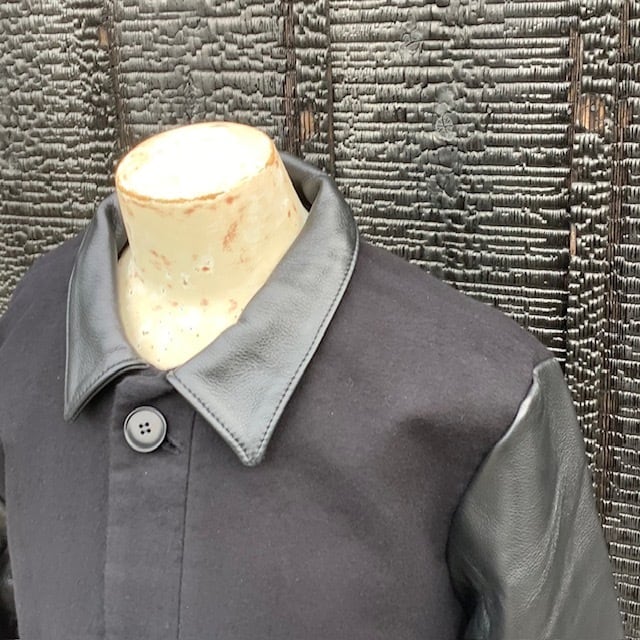 旧式の織機の廃棄と工場閉鎖によりジャーマンレザーの生地が作れなくなったことで一時生産を休止していましたが、 かなりの要望があり、なんとか期待にこたえるためにデザイナーが探しまわり、とうとう作り上げた生地がこのジャーマンレザーです。 ドイツ国内のファクトリーで、また、今できる限りの状況下で織り上げた生地は、これまでのものと同じとは言えませんが、充分に高密度の織りが出来上がり、自信をもって紹介しています。 こちらの襟とスリーブをレザーで切り替えたボンバージャケットは短めの丈でコンパクトな仕上がり。ポケットの縁にもレザーを施し、大きめのボタン。革ジャン感覚なデザインですが、ジャーマンレザー生地とのコンビはシンプルでありながら強い個性を表します。通の逸品です。 革のように柔らかくなるジャーマンレザーは、長く、このアイテムを育てて、アタリや色落ちに至るまで楽しんでください。
