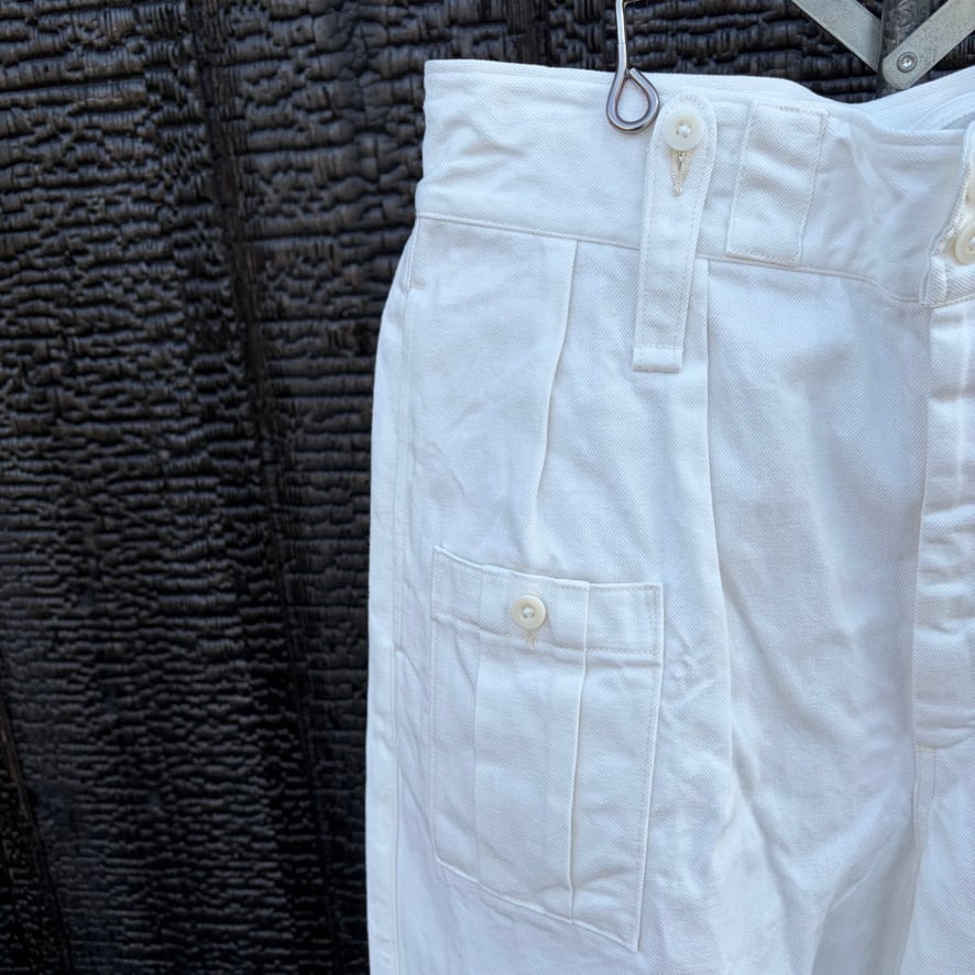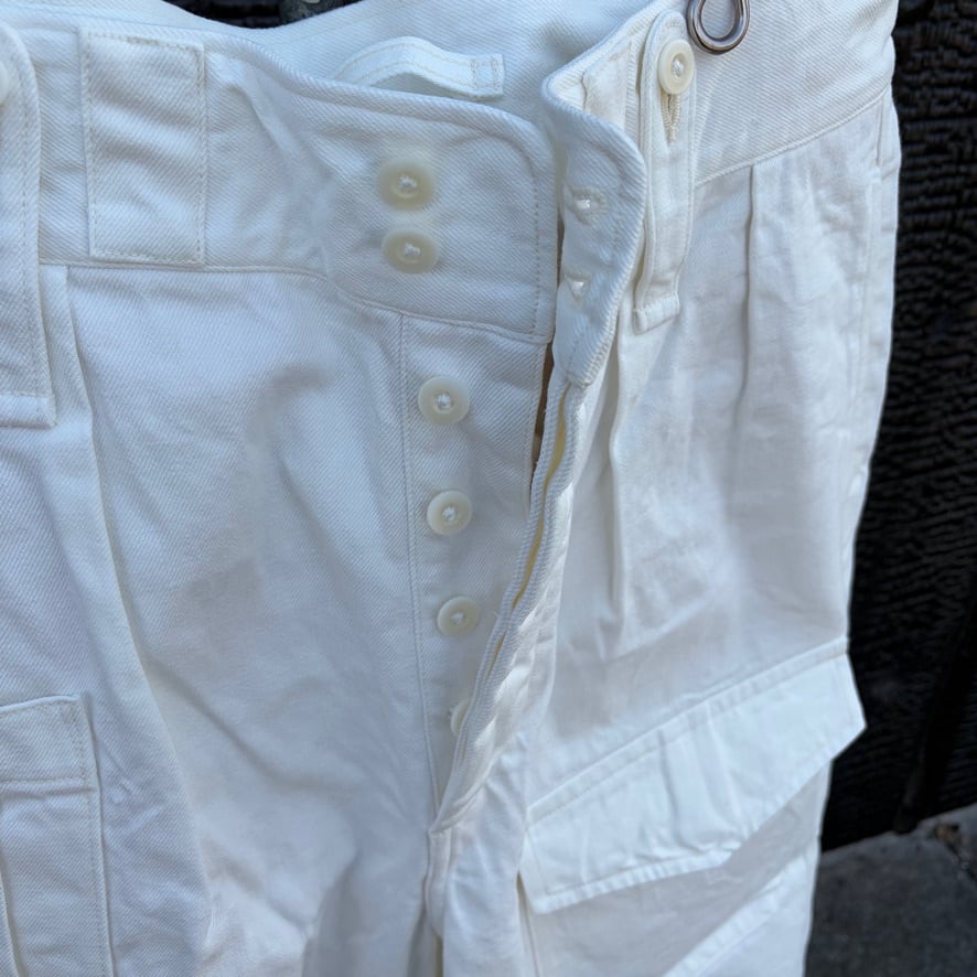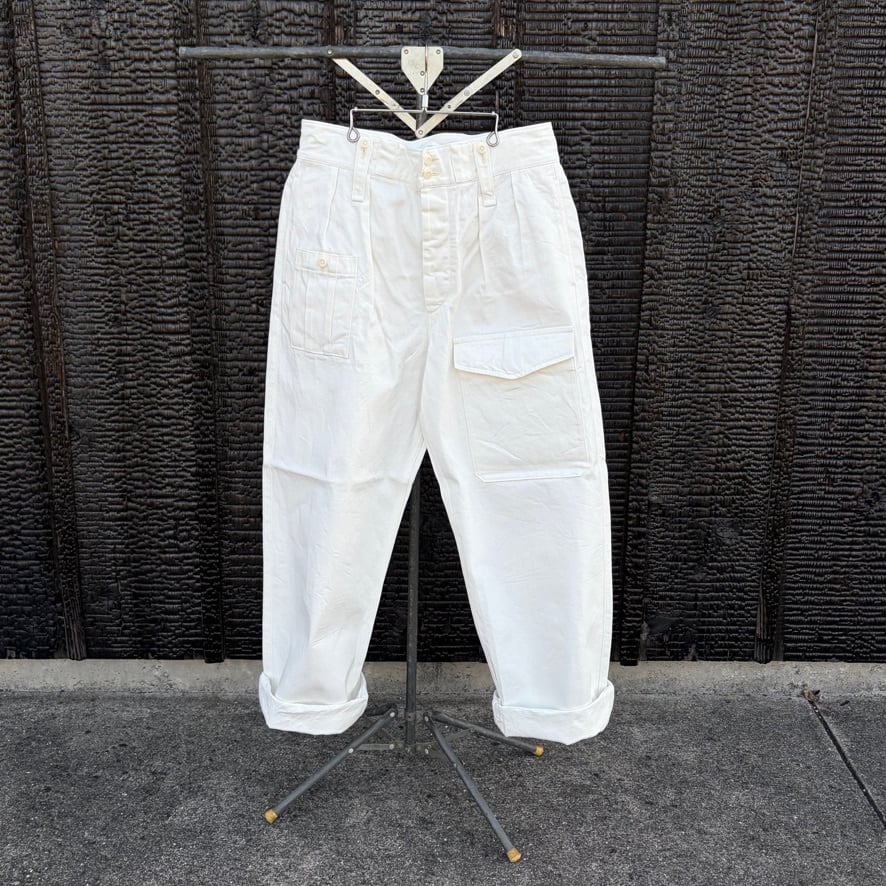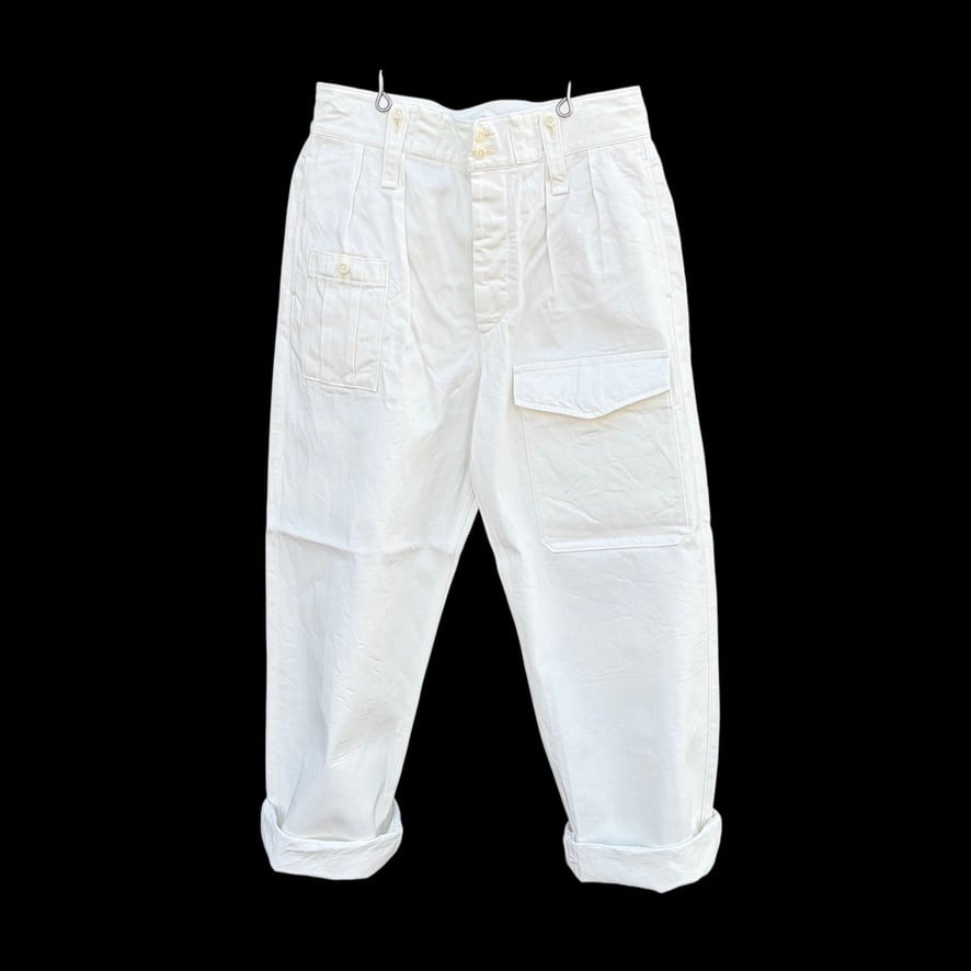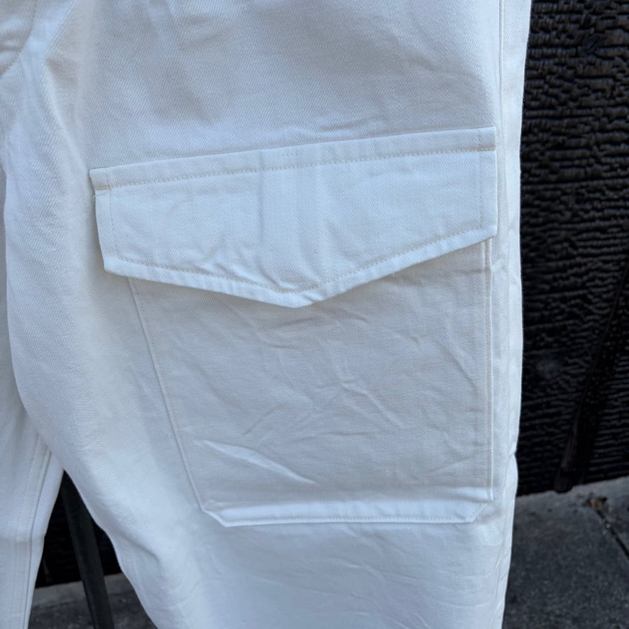 英国軍のミリタリーパンツをベースにしたブリティッシュアーミーパンツのホワイトデニムバージョン。機能的なディテールはそのままに、クリーンなホワイトデニムを採用することでミリタリー由来の力強さと軽快さを両立しました。