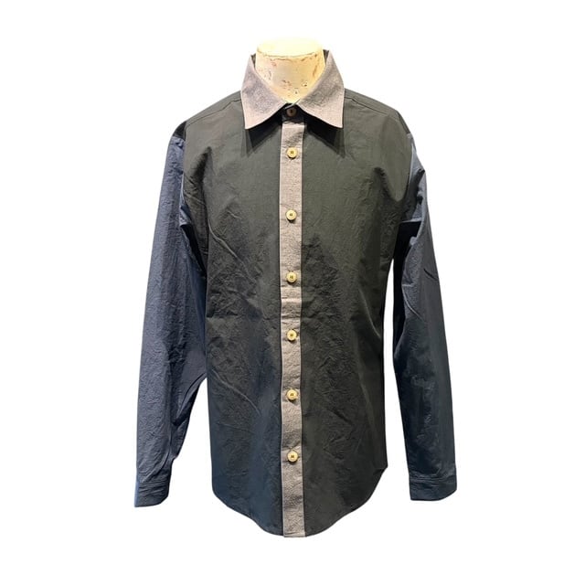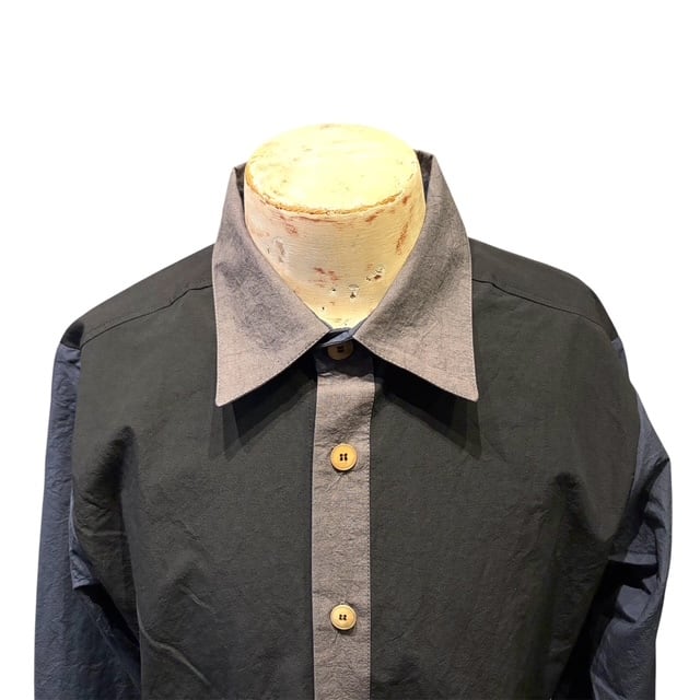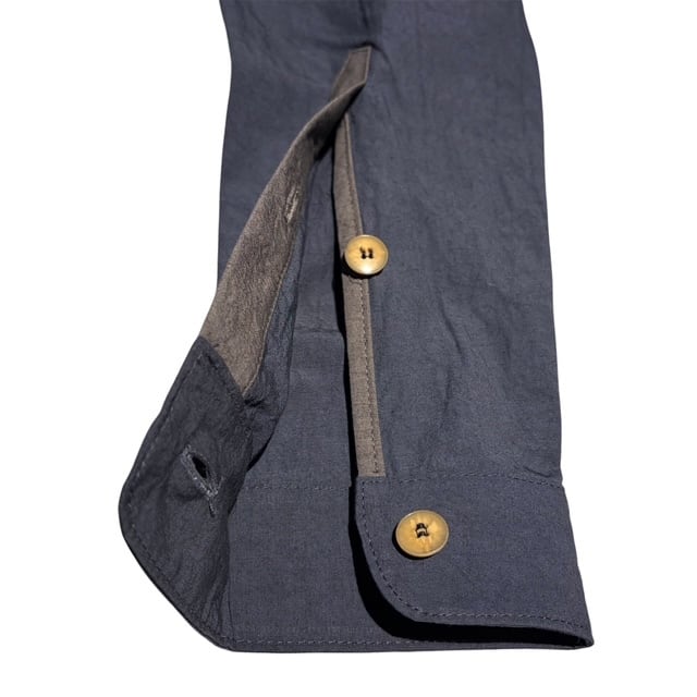 顔料染めとウォッシュ加工を施した生地の組み合わせで、シワや擦れ加工がヴィンテージ感をプラスしています。コットン80%リネンが20%入っていますが、感触はコットン100%のようにパリッとシャリッとしています。3色の組み合わせで仕立てたシャツはすっきりした印象に、リネンの20%で見た目より涼しいシャツです。