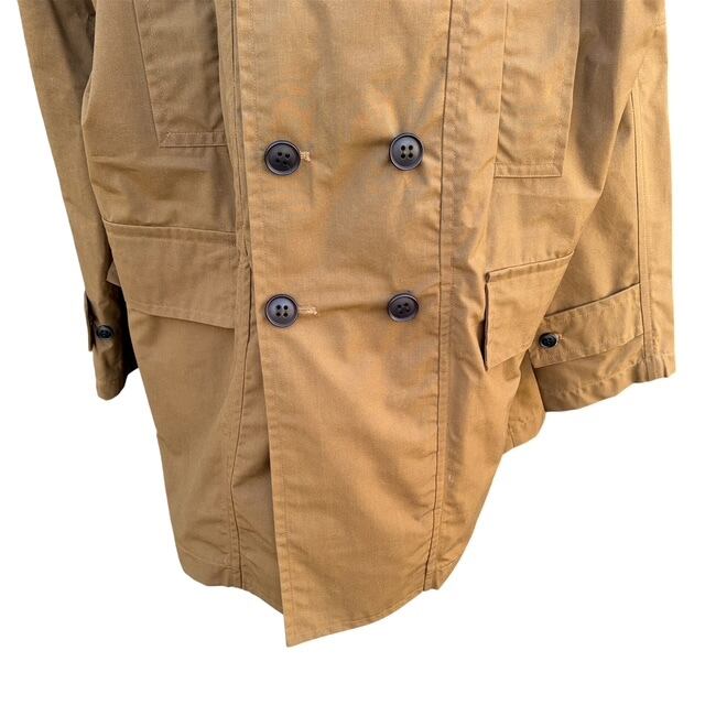 100% ドライワックスコットン素材を使用し、現代的なシルエットと実用的なディテールが特徴です。イタリア海軍のオリジナルコートをベースにデザインされ、胸に2つのドッカースラントポケット、下部に2つのウェルトポケットを追加し、デザインを一新。全体に施された 1/2 インチのトップステッチが高級感を演出します。たっぷり生地を使ったオーバーサイズカットで、カジュアルな着心地を保ちつつ、重ね着にも十分なゆとりがあり、両サイドにボタンホールを持ち、ダブルブレステッド・ユニセックスで着用できます。スコットランドのHalley Stevensons 社の協力を得て、ブランド独自の150 g/m2 軽量ワックスコットン仕様も注目の的で、耐候性のあるマッドな仕上げを施しています。この生地は1910年に防水加工の特許を取得。この仕上げは、最もドライなワックスとソフトなエアロタンブリングを組み合わせたものです。ワックス仕上げは、軽量で通気性に優れ、耐候性のある衣服に最適です。