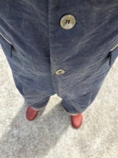 モールスキンの印象は冬の素材、厚みのある柔らかめの感触、その印象が180度変わっています。洗いをかけたことで、生地は少し固めでドライなタッチではあるものの、まるで新聞紙の表面に霧吹いて乾かしたような印象を受け、色が薄れ、スモーキーなグレーの印象を放った CHARCOAL GREY は別名煙色と命名したい程です。私も昔訪れたことのある冬のベルリンの空のような共感を得るほどです。相対する表裏生地のクリーム色のようなベージュがブレザーではポケットに、トラウザーズではバックポケットと裏地にあしらわれ、ロールアップすることでまた違った表情を見い出すブランドらしいアイテムに仕上がっています。セットアップの相性は抜群、単体としても着回しに富んだ、掠れチックな独特の表情で魅了されてしまいます。