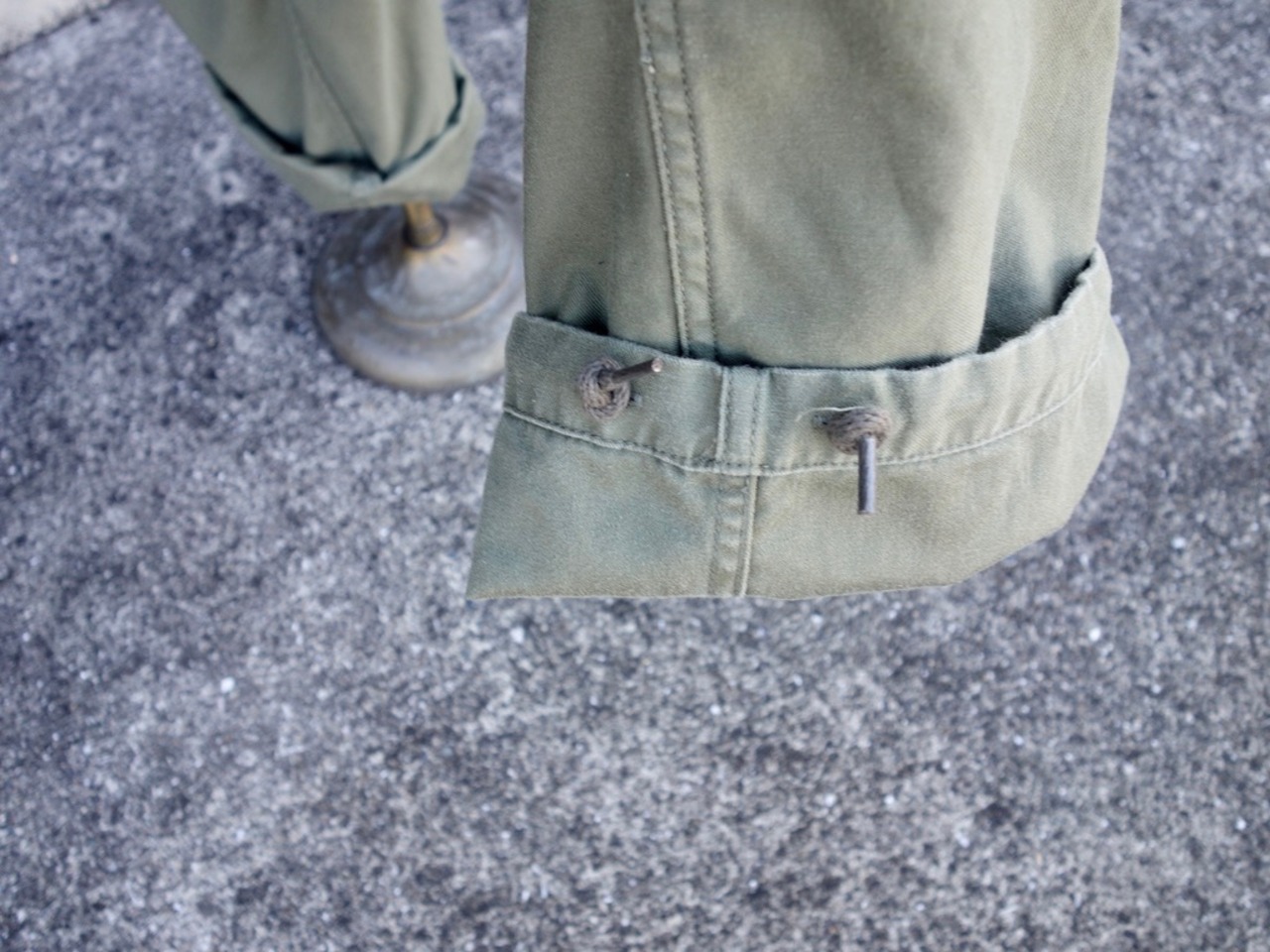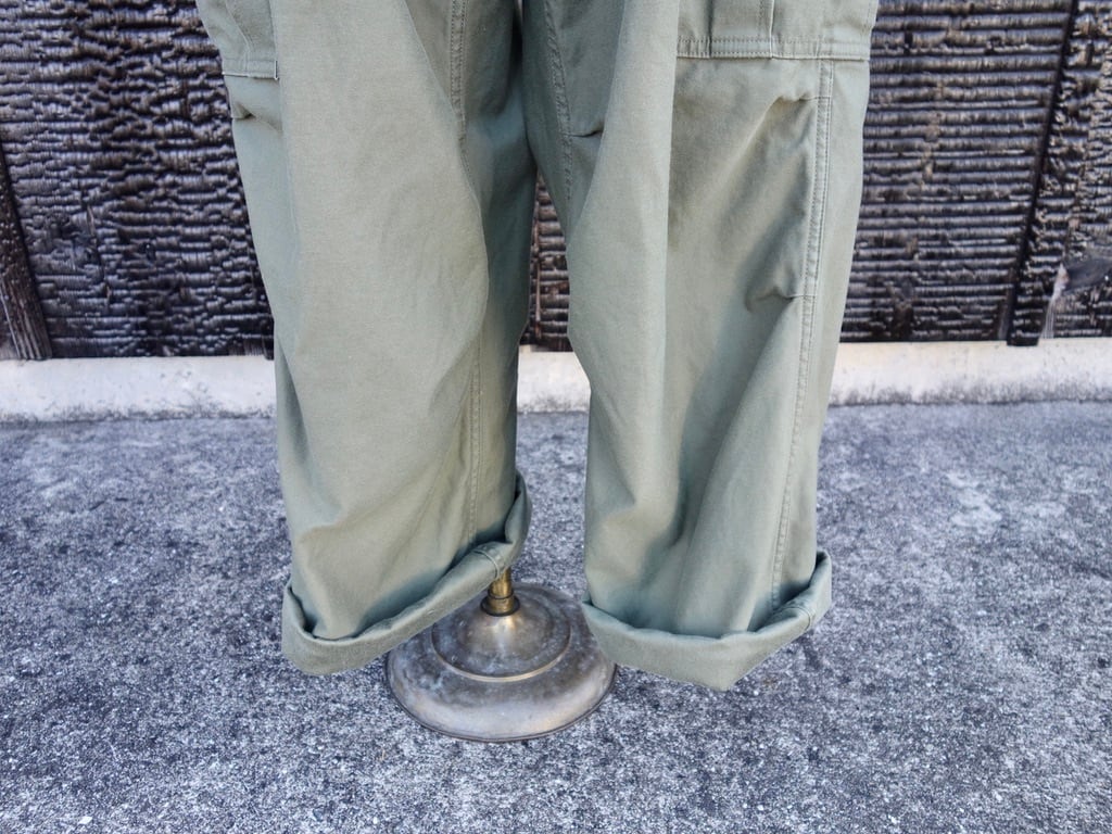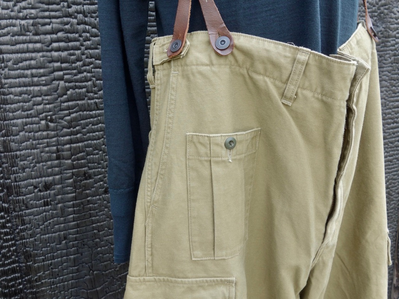 米軍のM-43と、カーゴパンツの傑作M-51、そして英国陸軍のビンテージをミックスしたデザインです。ファブリックはバックサテン。非常に剛性の高い組織です。素材はM-51同様にコットン100%。M-51の後継であるM-65では、素材がコットンナイロンに変更となります。些細な素材変更に見えますが実はその背景には大きな事象が隠されています。世界初の合成繊維であるナイロンの発明そのものです。ナイロンは米国で1935年に発明され、ナイロン糸が様々な繊維製品に普及していったのは1950年以降です。つまり、51年制式採用のM-51の時代にはナイロンは存在していたものの未だ物珍しい素材でしかなく、65年採用のM-65の頃には爆発的に普及し、コットンとナイロンの混紡糸が使用されたという事です。合成繊維がごく普通のものである私たちの感覚からするとちょっと興味深い事実です。
