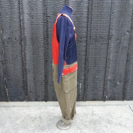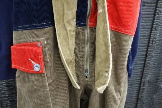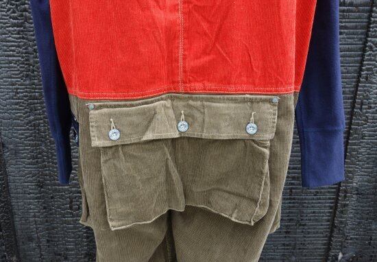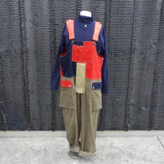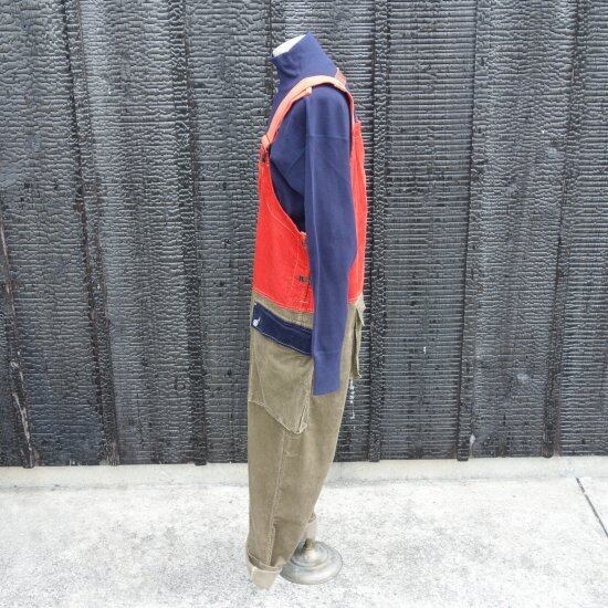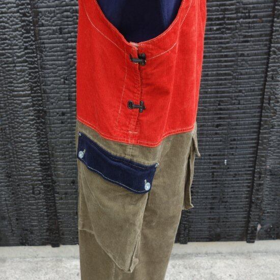 ナイジェルケーボン自身も愛用している1940年代のUS NAVYのDECKパンツをベースにアレンジされています。USMC-M44スタイルのカーゴ&バックポケットのディティールを盛り込んだナイジェルケーボンのオリジナルデザインに仕上がっています。ファブリックには初となる12ウェールのコーデュロイ生地が採用されたクレイジーパターン。朱色の様な赤と紺、茶色とベージュをパズルの様に組み合わせ、コーデュロイ生地の表情も加味され絶妙なアシメトリーな表情を放ちます。 毎シーズン即完売する人気物のオーバーオールです。