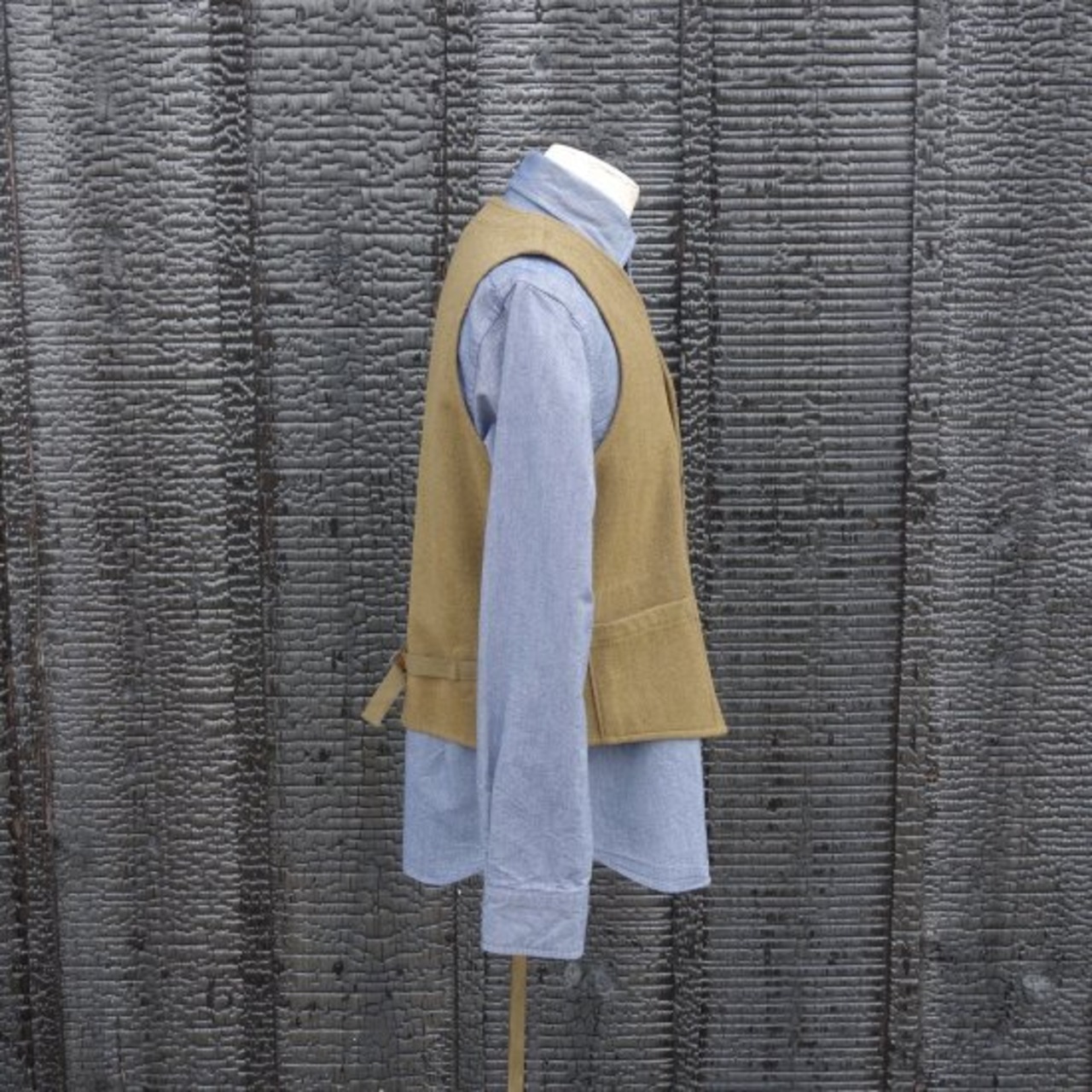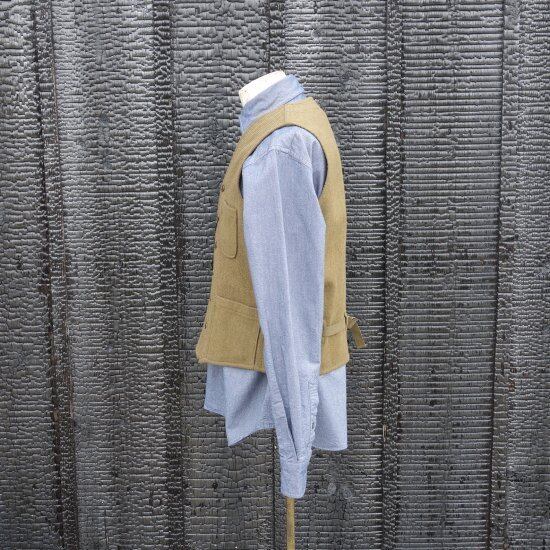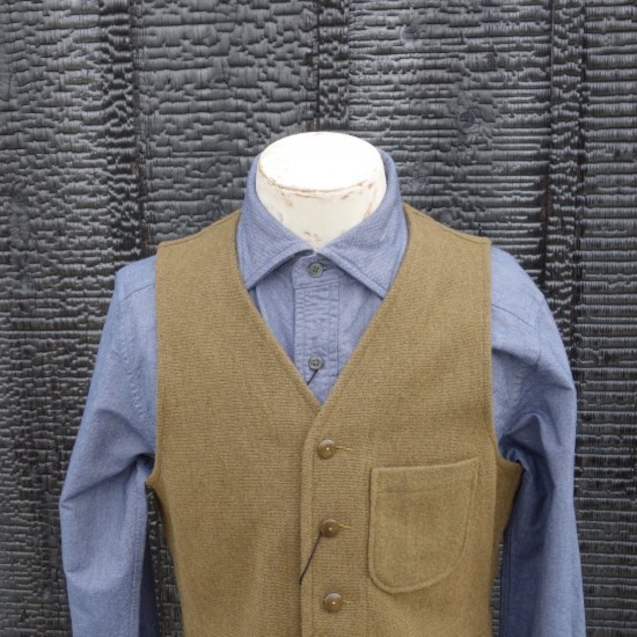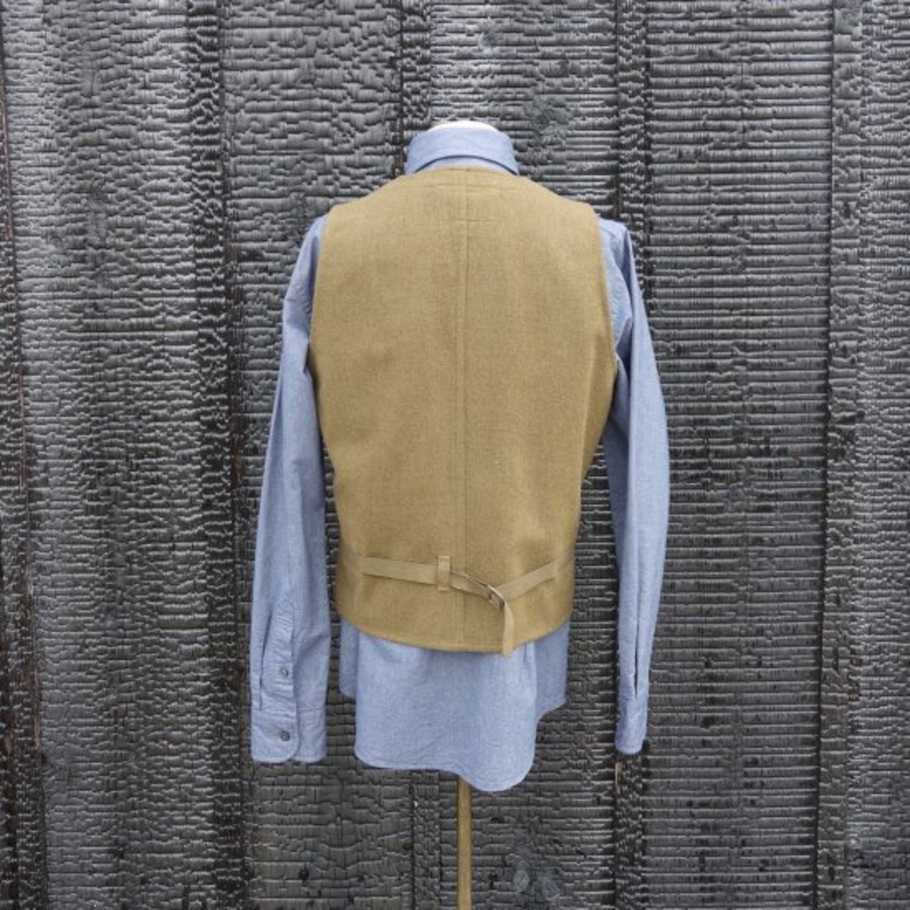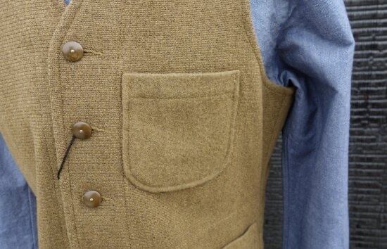 6つのチェンジボタンのベストです。一見は単色のベストの様ですが、凝視するとローデンクロスとラッセル編みのコンビネーションで表情豊かに仕上がっております。裏地は無く、ポケットは外側に3つ用意されておりますので、ポケット無しのシャツなどと組み合わせても便利です。背後の腰部にはクラシックなウエストベルトが更なる雰囲気を高めています。※HOSPITAL JACKET RASCHEL Khaki とセット着用もお勧めです。