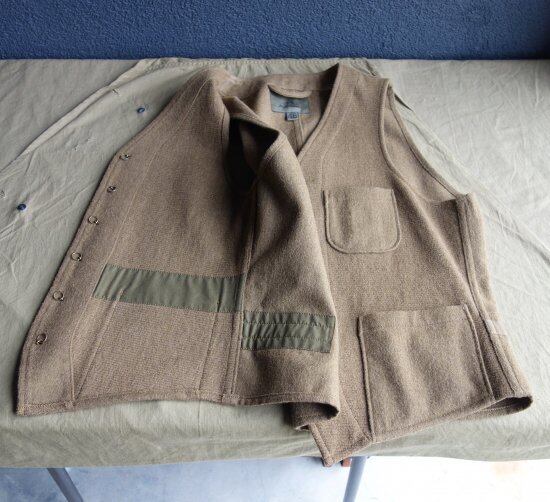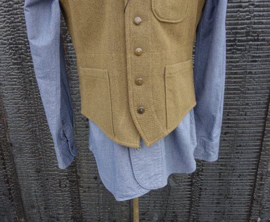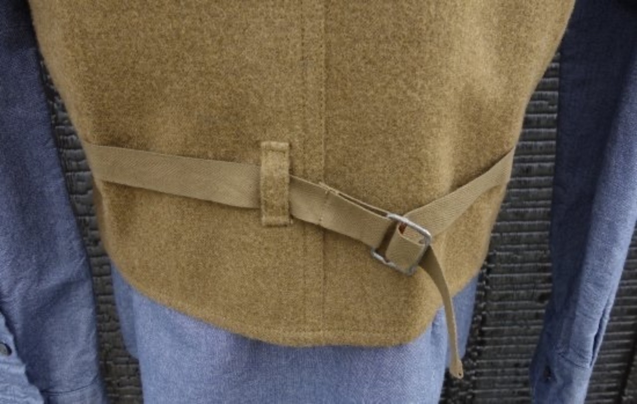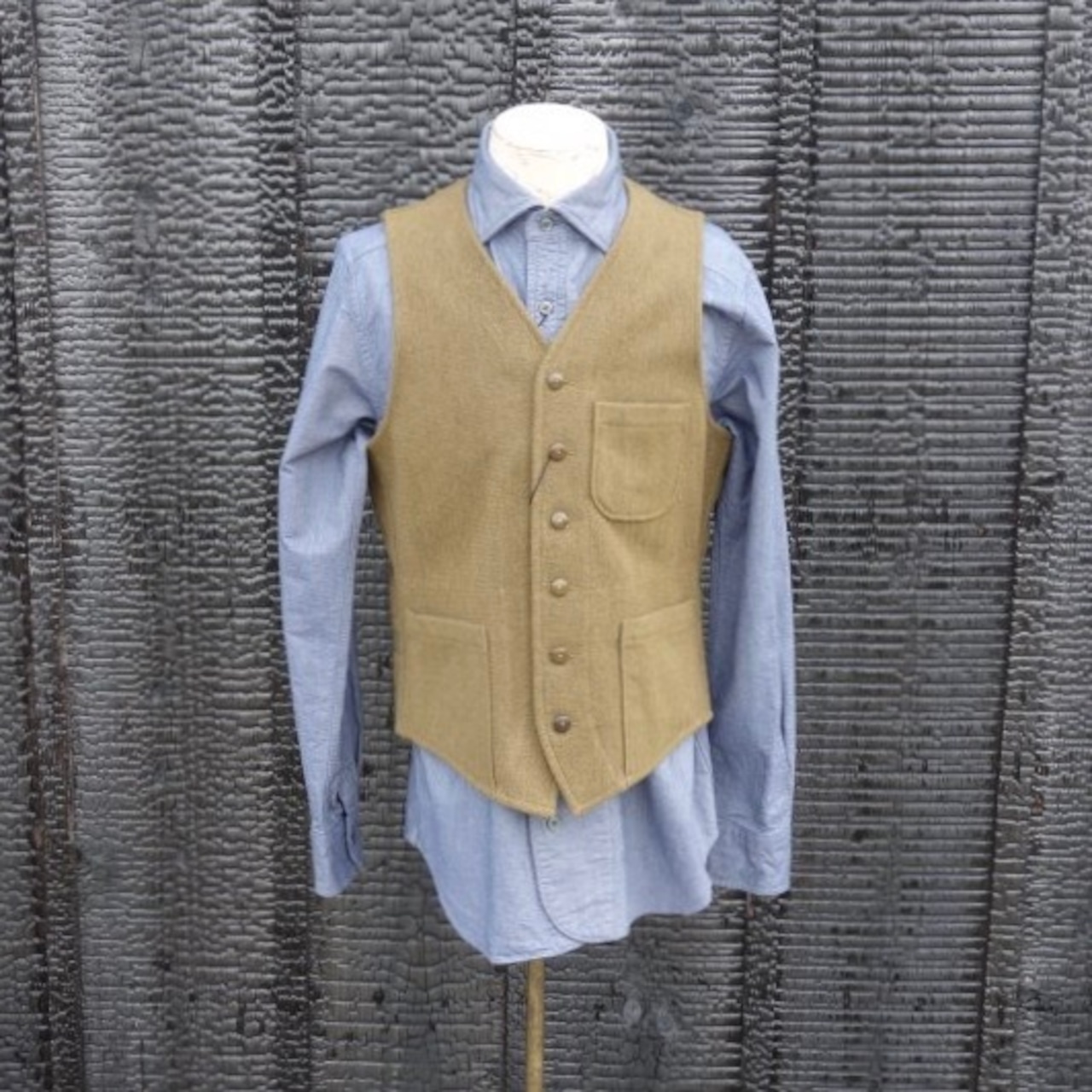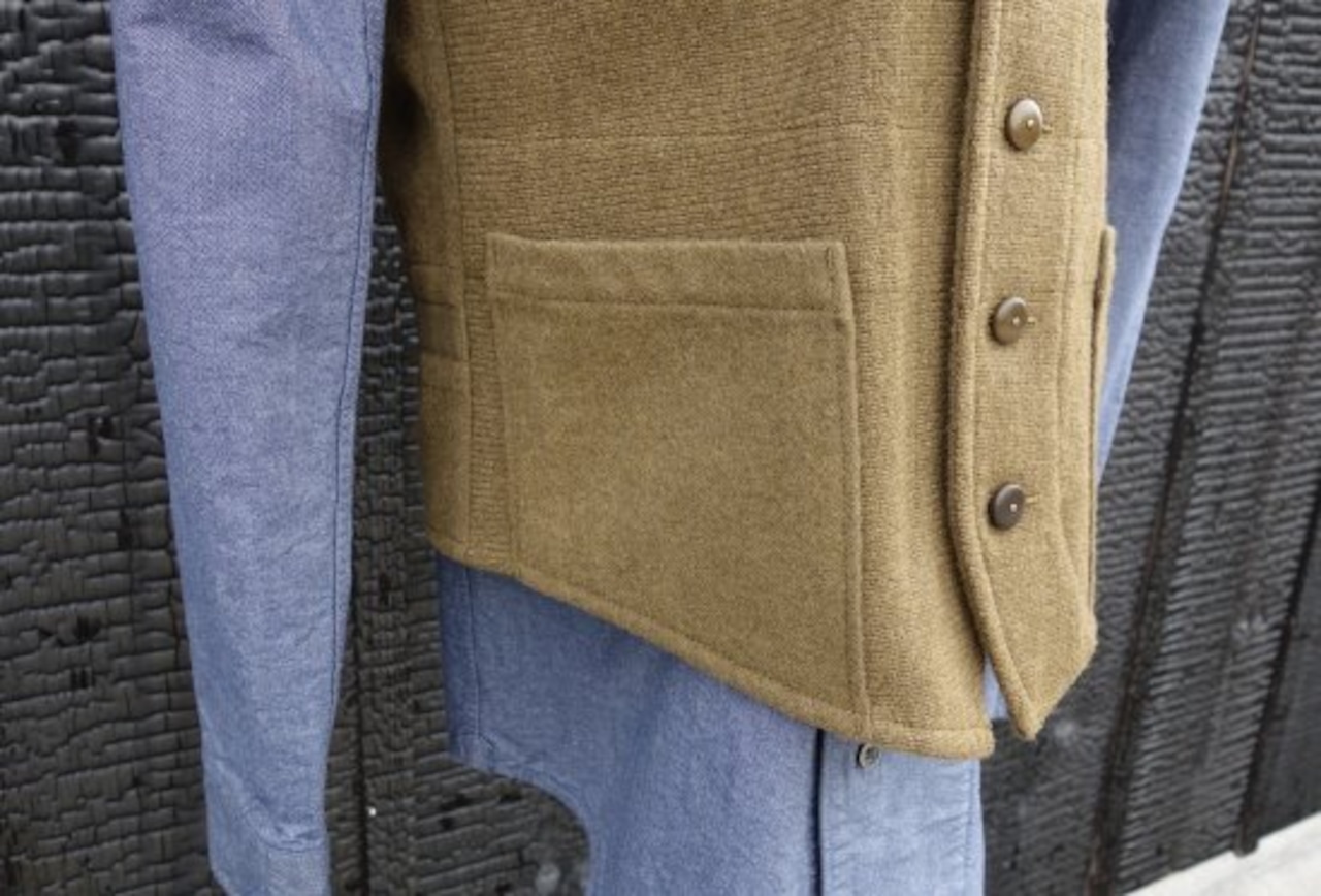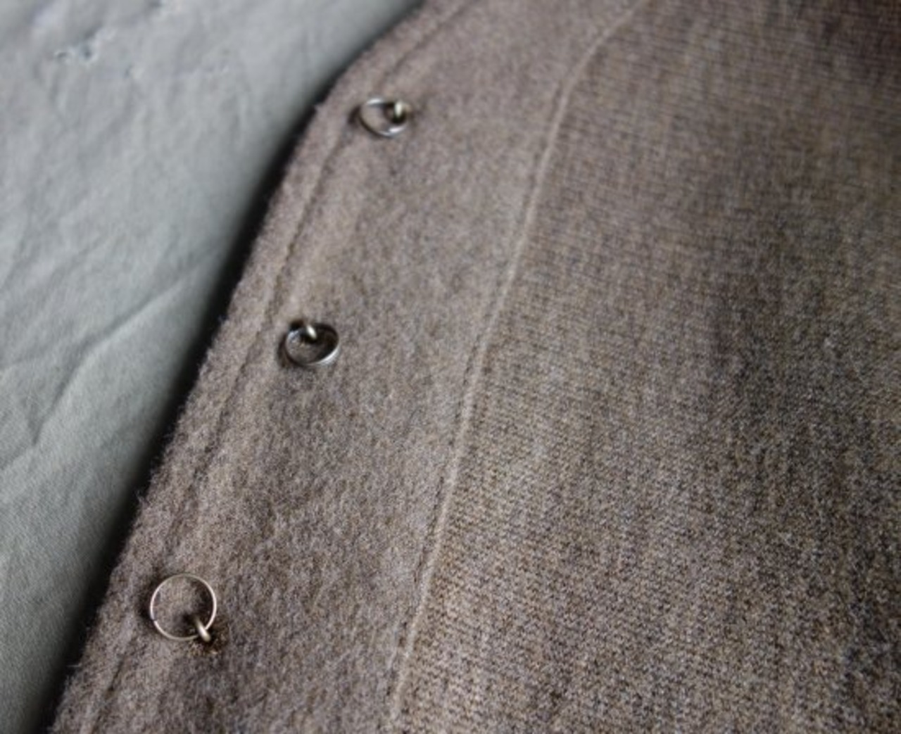 6つのチェンジボタンのベストです。一見は単色のベストの様ですが、凝視するとローデンクロスとラッセル編みのコンビネーションで表情豊かに仕上がっております。裏地は無く、ポケットは外側に3つ用意されておりますので、ポケット無しのシャツなどと組み合わせても便利です。背後の腰部にはクラシックなウエストベルトが更なる雰囲気を高めています。※HOSPITAL JACKET RASCHEL Khaki とセット着用もお勧めです。