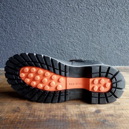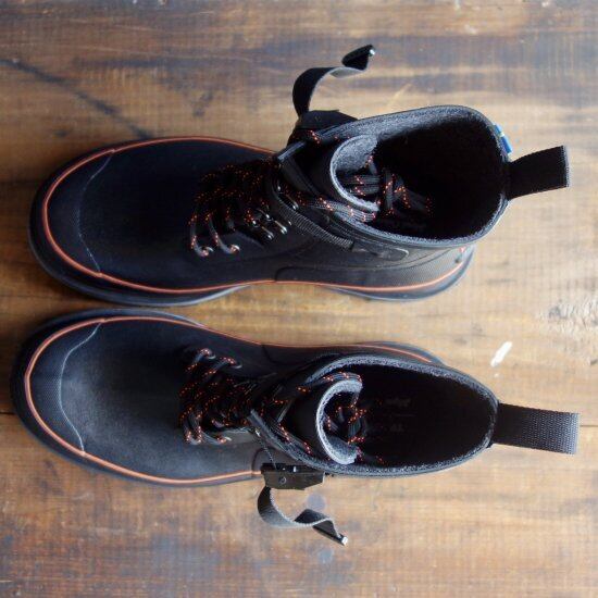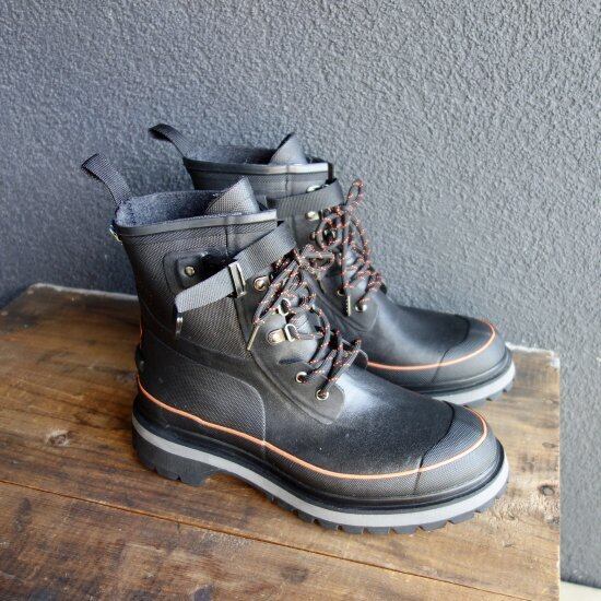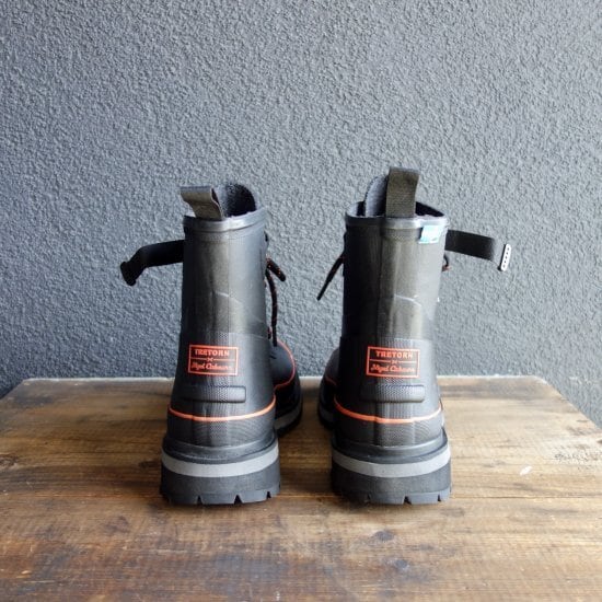 この限定ラバーブーツはTRETORNの作業用、安全用、ハイキング用ブーツと、ナイジェル・ケーボンの特徴的な美学の融合したデザインです。頑丈かつ軽量なアウトソール構造と、上部の強固な多層ゴム構造と耐久性のある金属製のトリムが組み合わさっています。
