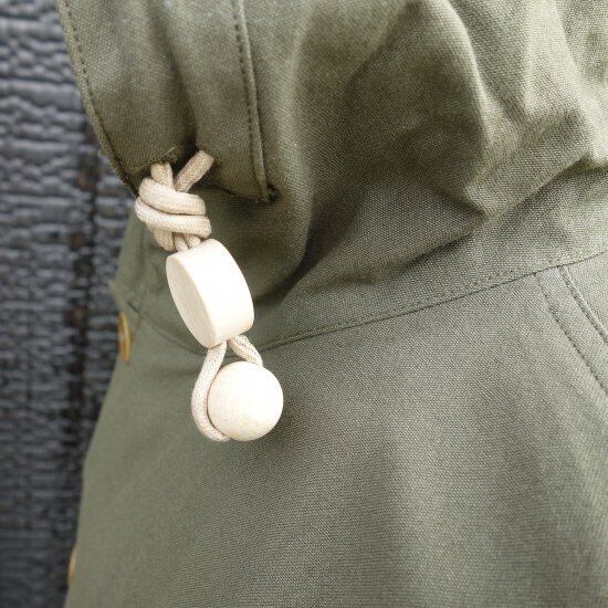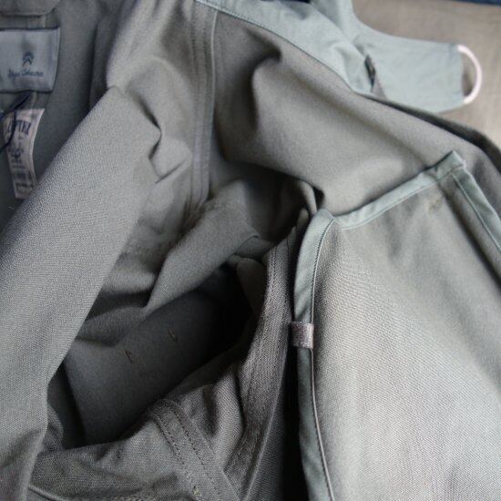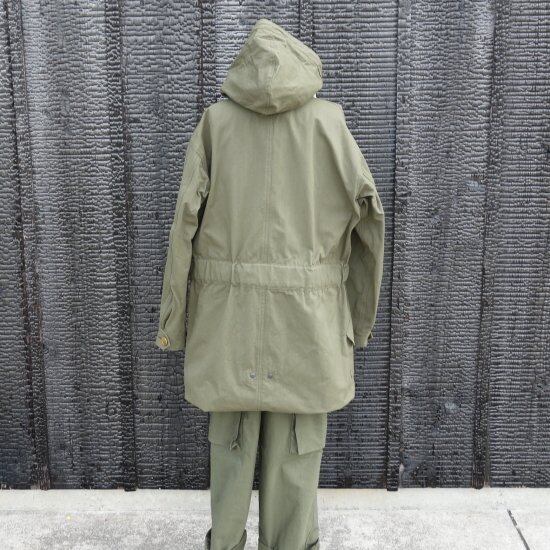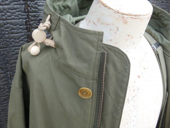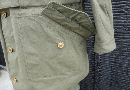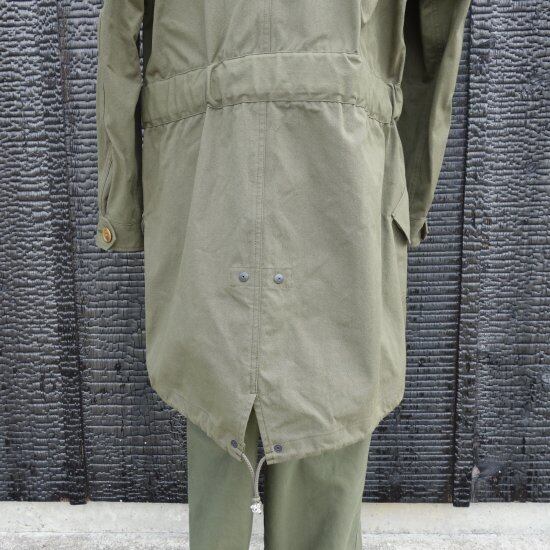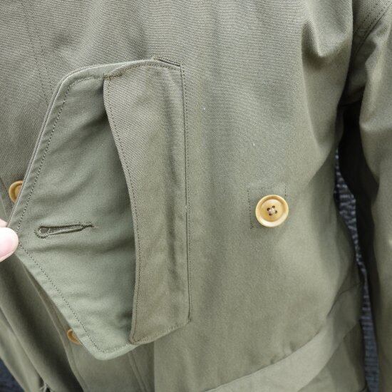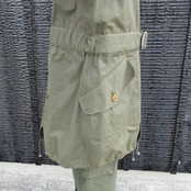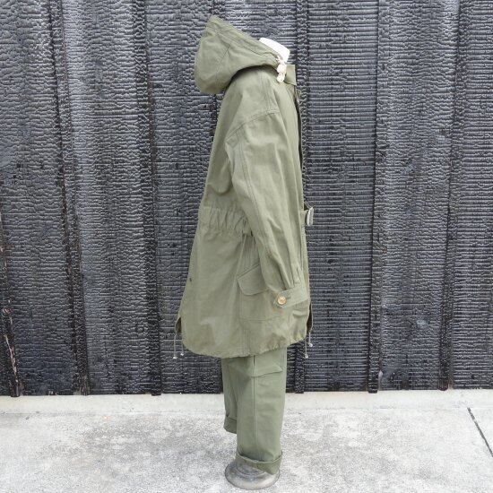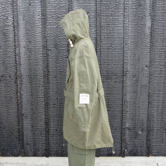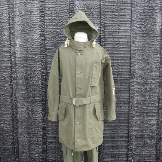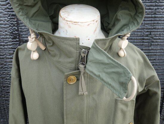 ファスナーとボタンの両方でがっちり前身頃を閉じる事ができるよう設計されています。右身頃のファスナー最下部はファスナーテープごと浮いた状態で、小さなフラップがセットされています。これにより厚手の手袋をした状態でもファスナーを掴みやすい仕様です。ファスナー最上部は第1ボタン位置を超えてさらに上方まで達する事と、フード部分にセットされたタブを固定する事で呼吸器系をカバーします。このタブとフード外周の調整のためのパーツは木製です。体はガーメントで、手足はグローブとシューズで覆われますが顔面はほぼ唯一露出する場所です。気温が非常に低い場合、熱伝導率の高い金属は素肌に触れると呼気に含まれる水分で肌に固着する危険性があります。この状態で無理に引き剥がせば皮膚を痛めてしまいます。一方熱伝導率の極めて低い木製パーツはその限りではありません。左胸に1箇所と両腰に合計3箇所のポケットがセットされています。左胸に位置しているのは、大方の人間の利き腕である右手で出し入れをしやすいよう考慮されているからです。これらポケットにはフラップがセットされていますが、この構造は極めて機能的です。通常のフラップはポケット口を覆うだけですが、本製品では異なります。本製品では身頃側とポケット側にそれぞれフラップが付いており、両者が先端の両端でカンヌキ留めされる事により、まるで封筒を封筒の中程でふたつに折り曲げるような格好になります。雨や異物はポケット内に侵入しづらくなり、ポケット内部の収容物はそう簡単に脱落しないようになります。左右の前身頃は、ボタンとファスナーの両方で閉じるよう設計されており、風雨を万全にブロックします。ちなみに英語でベルトアンドブレーセスと言う言い回しがあります。ベルトとサスペンダーを両方着用する様から、万全の備えを比喩します。本製品の場合は右身頃側にジグザグステッチの打たれた風よけのタブもセットされていますので、3重の防御が施されています。袖口もボタンで開け閉めでき、シャツなどであればスリットが切られている部分に三角形のガゼットが充てられている事が確認できます。スリットからの風の侵入を防ぐ仕様であり、パラトルーパー(落下傘降下兵)の着用するアウターウェアなどに多く散見されます。左上腕部にはペンシルポケットがセットされ、2本のペンを収納できます。銃器やナイフなどの武器類の方が存在として派手なので、その存在が忘れられがちですが、作戦行動にとって筆記用具は必須です。平穏な環境であれば、ジャケットの内ポケットからのんびりとペンを取り出し、キャップを開けるのでしょうが、本製品の場合は如何なる状況でもさっと取り出せ、また仕舞えるように最外殻のアウターシェルにペンポケットが配置されている事に特徴があります。左上腕にあるのは右利きの人間が大部分である事を考慮しているからです。とても地味で小さなペンポケットですが、本製品が投入された環境の緊張感を如実に語るようです。ウエスト周りにはベルトがセットされています。金属製の頑丈なバックルはヴィンテージのそれを忠実に再現したものです。細かい点ですが、こうした金属製のバックルはデザイン、大きさ、素材など様々ですが、そのほぼ全ては画一的で無難なものであることが殆どです。何故なら均一で、ある程度使い回しのできるようデザインされたものが既製品として大量に生産されているからです。スソ部分は、M-51のディテールをミックスしています。フィッシュテールとも呼称される独特の形状は、前後左右のスピンドルを使って太股部分に結びつけ、より強固に体に密着させるためです。斜めに切ってあるデザインに特徴があるため、多くのデザイナーがその意匠だけを模倣している部分です。それらの大部分が意匠のための意匠で終わってしまい、元々は機能のためのデザインが忘れ去られてしまっている例と言えるでしょう。このような着用方法をしない場合は後ろ身頃スソを内側に折り込んで収納できる設計になっています。