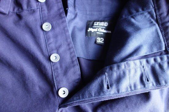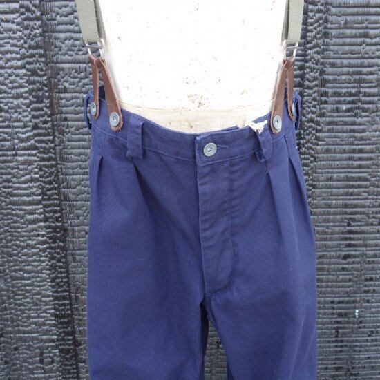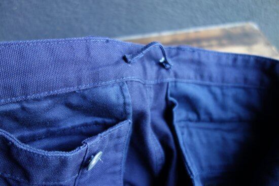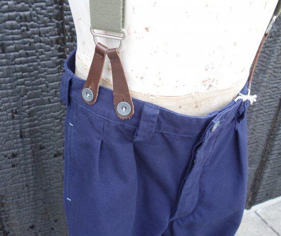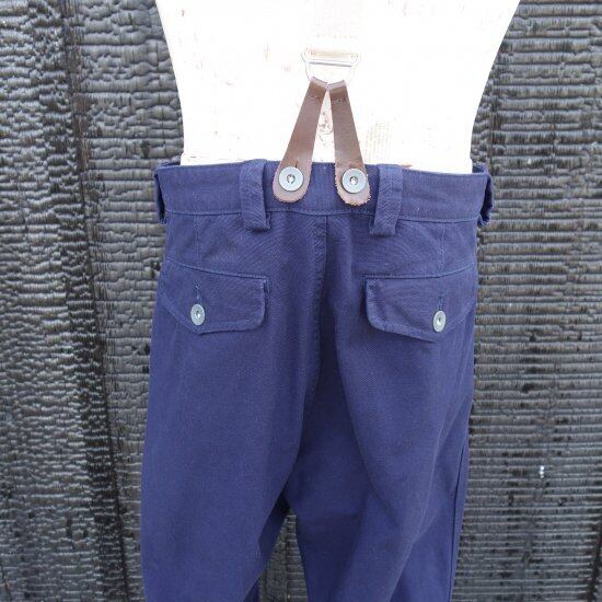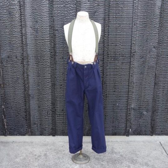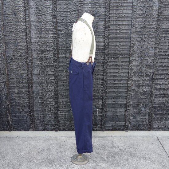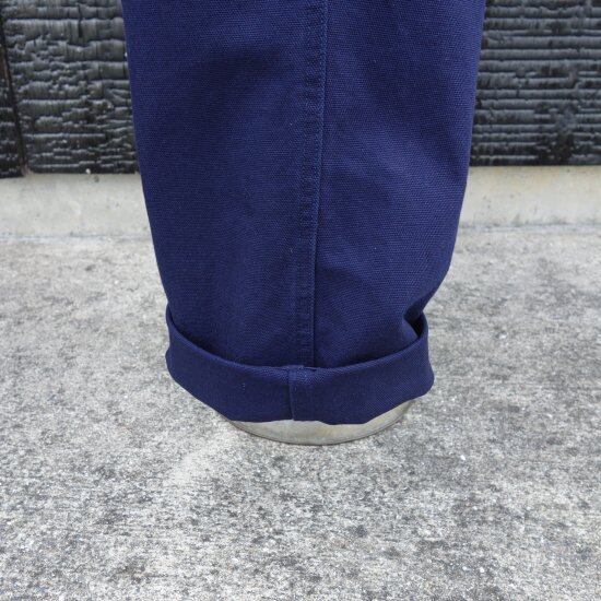 100% COTTON CANVAS の生地を使った 4 プリーツタイプのボタンフライ式チノパンツです。ポケットはフラップ付きのバックポケットを含む4 ポケットパンツです。股の部分にはマチが施され、初めからサスペンダーボタンがセットされているので、ストレスフリーで、クラシックな着こなしも楽しめる、育てがいのあるパンツと言えます。