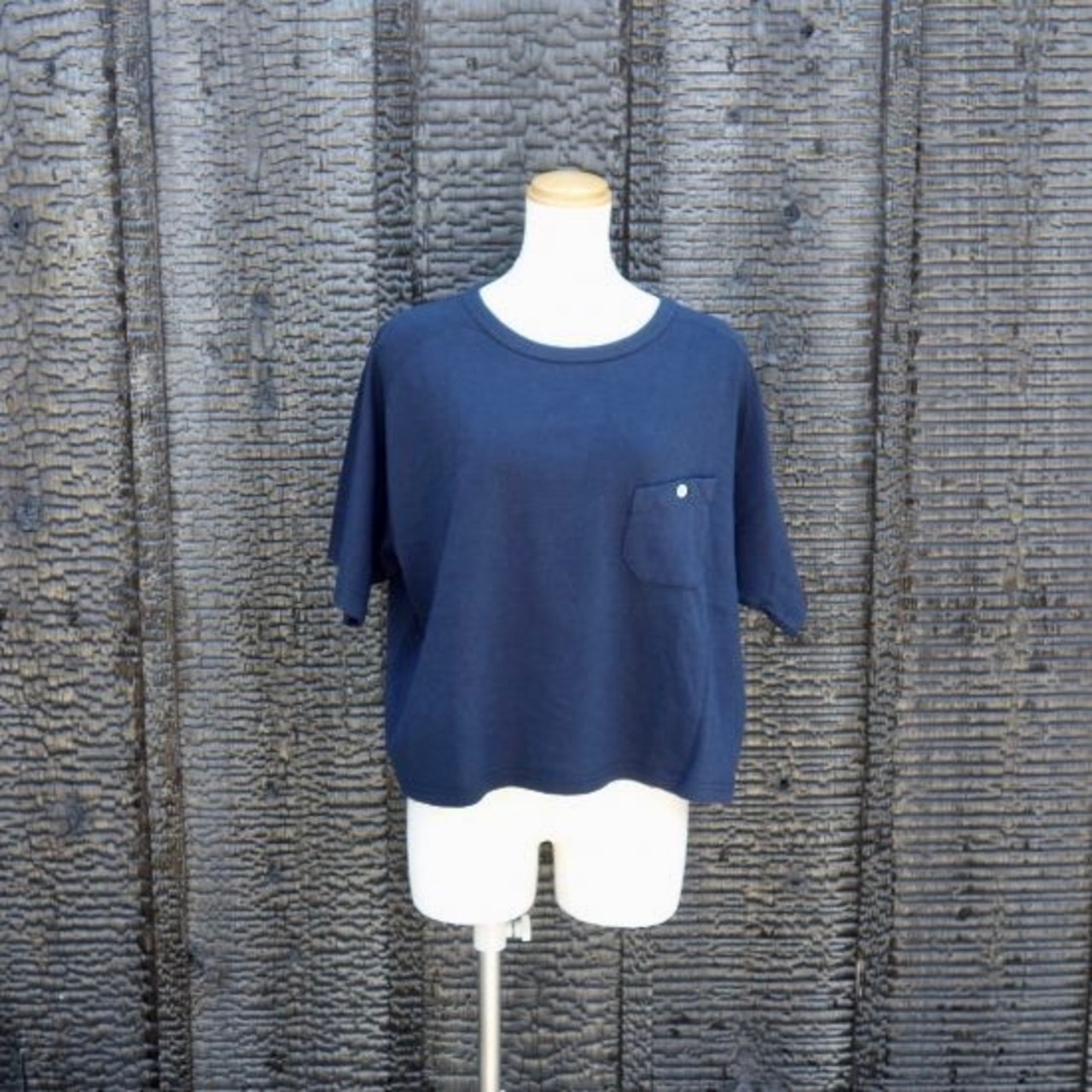 100% コットン素材のクルーネックのポケット"TUNIC T-SHIRT"です。袖の繋ぎ目はビンテージウェアに見られるフリーダムスリーブという腕に自由度を持たせたデザインや脇部分の縫い目を持たない丸胴ボディ仕様は、きめ細かい着心地と長く着用することを前提に作られております。着丈は短めで、身幅に余裕を持たせたシルエットは女性らしいシルエットでお楽しみいただけます。左胸ポケットにはメタルボタンが採用されるなど、細部のディテールにまでこだわりを感じるカットソーです。