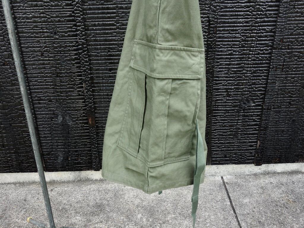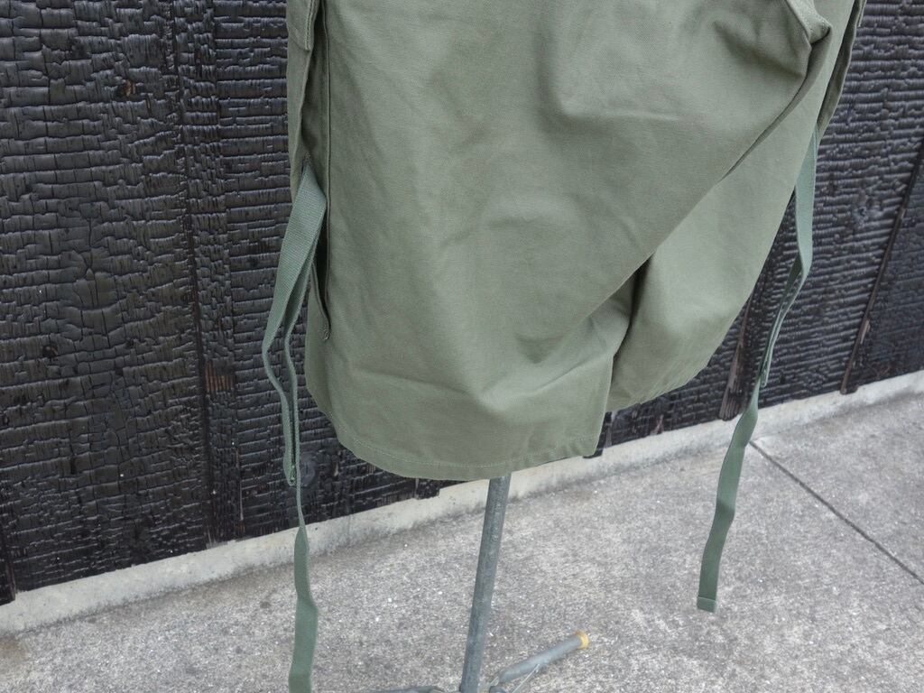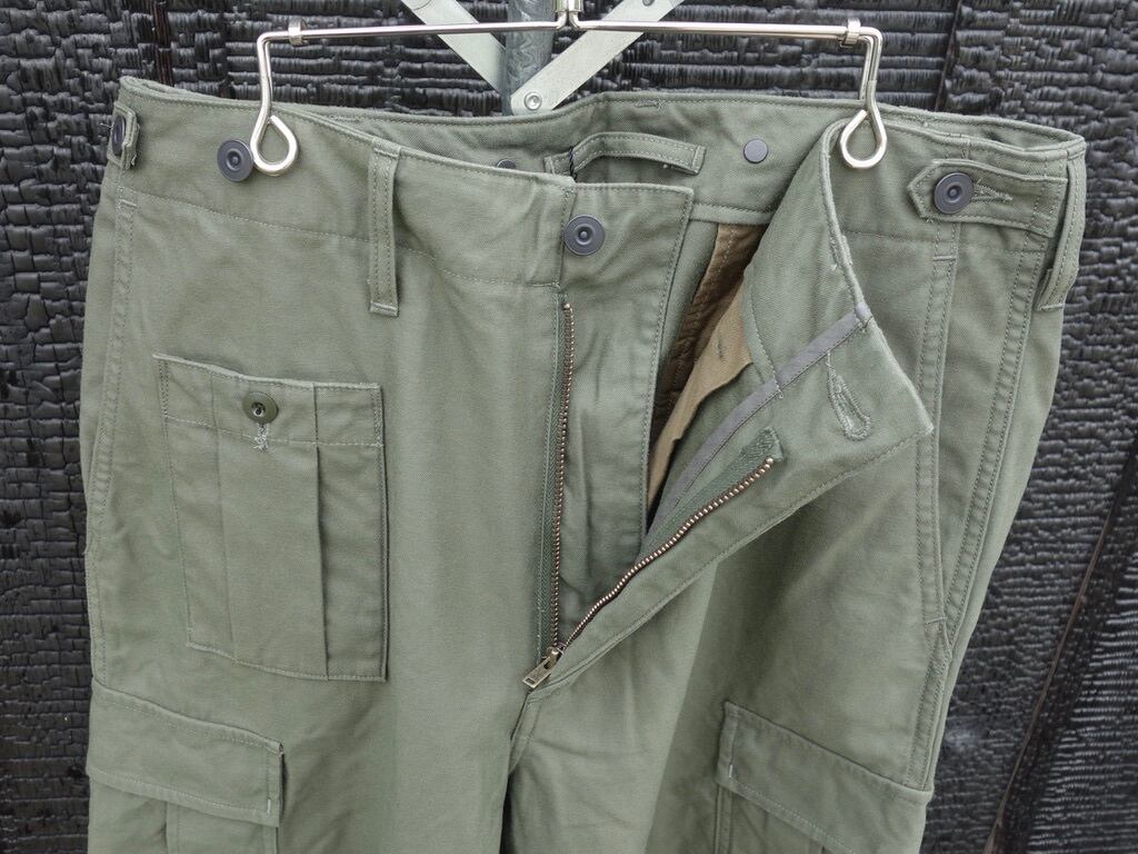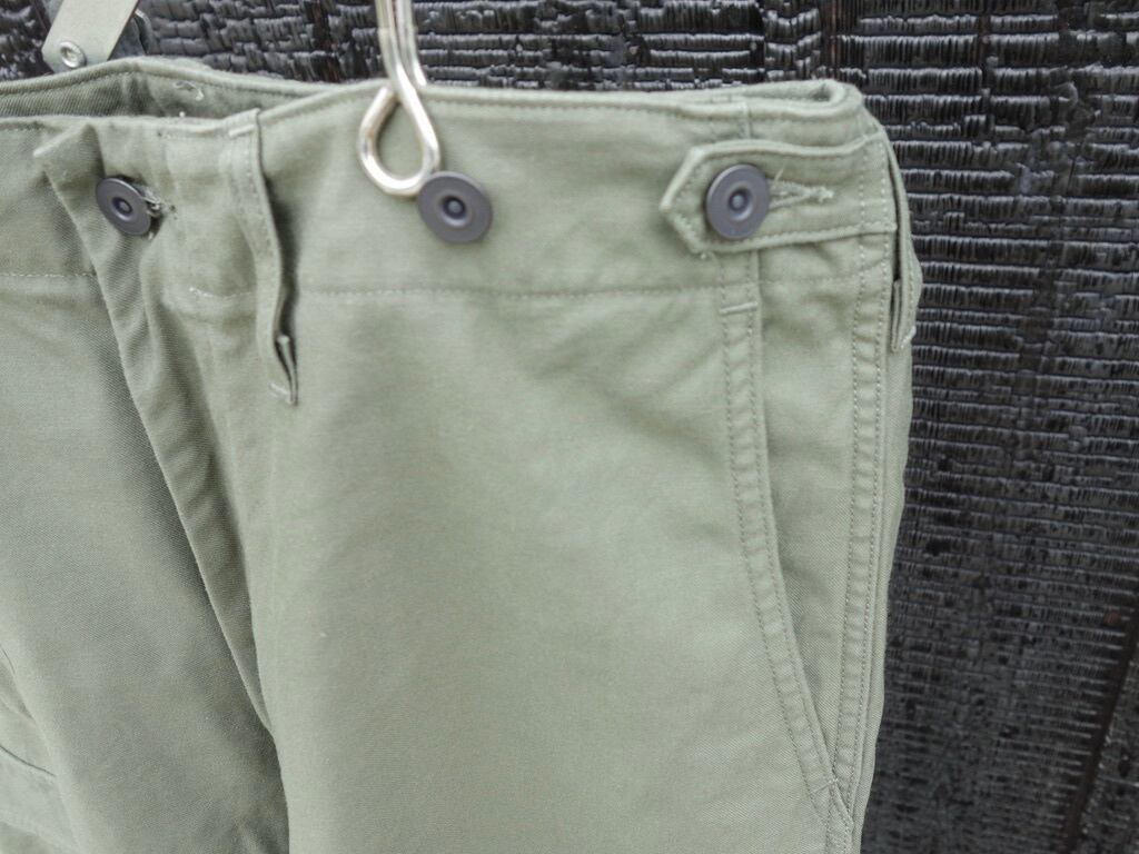 ファブリックはバックサテン。非常に剛性の高い組織です。素材はM-51同様にコットン100%。M-51の後継であるM-65では、素材がコットンナイロンに変更。些細な素材変更に見えますが実はその背景には大きな事象が隠されています。世界初の合成繊維であるナイロンの発明そのものです。ナイロンは米国で1935 年に発明され、ナイロン糸が様々な繊維製品に普及していったのは1950 年以降です。つまり、51年制式採用のM-51の時代にはナイロンは存在していたものの未だ物珍しい素材でしかなく、65 年採用のM-65の頃には爆発的に普及し、コットンとナイロンの混紡糸が使用されたという事です。合成繊維がごく普通のものである私たちの感覚からするとちょっと興味深い事実です。