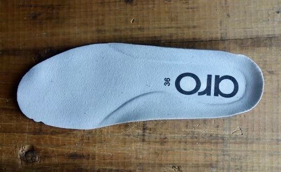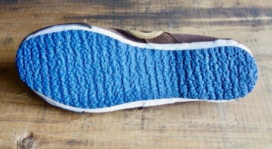 NET(メッシュ)素材をベースに丁寧に作られている印象です。aro(アロ)のロゴマーク(ゴムのような素材)が両サイドとベロの部分にしっかりと縫い付けられています。インソールは着脱可能です。画像でもお判りの通りインソールには厚みがありクッション性の高さを伺えます。見るからに風通しの良い蒸れにくいスニーカーと言えます。アウトソールは波型が刻まれているので滑りにくく、靴下がやや透けて見えるのでご自分の好きなように靴下でアレンジしても楽しめるスニーカーでもあります。