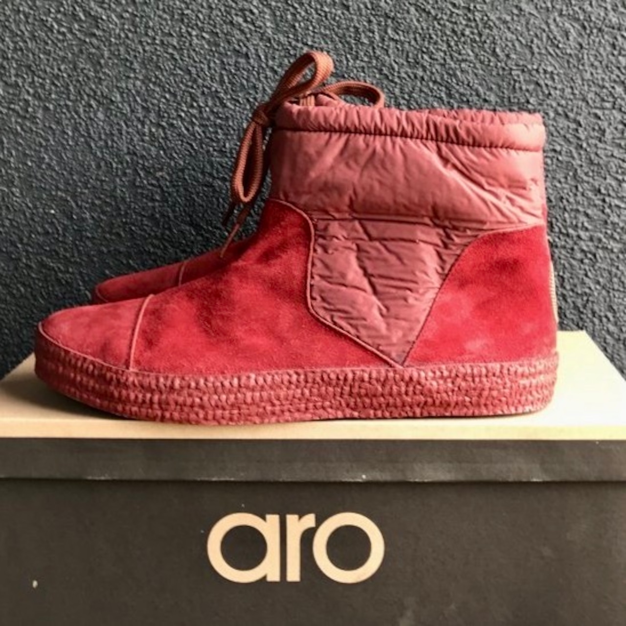 ファッション性豊かなウィンターブーツの様な印象を受けます。クッション性が高く丁寧に作られており、aro(アロ)のロゴマーク(ゴムのような素材)が踵の真後ろにしっかりと縫い付けられています。アウターソールは波型が刻まれているので滑りにくく、インナーソールは着脱可能となります。