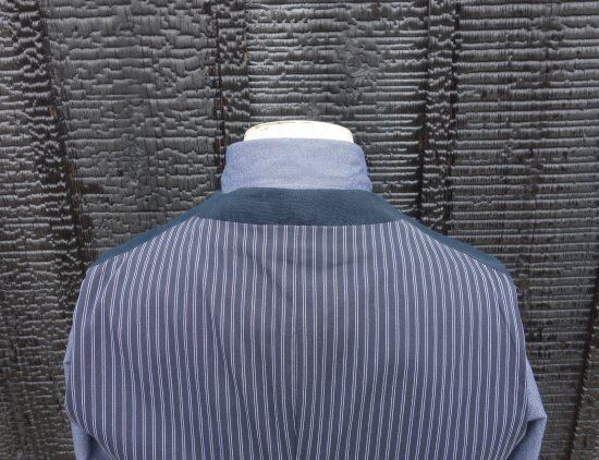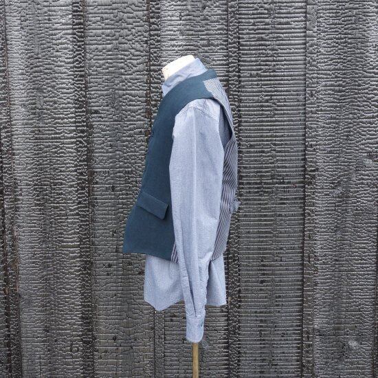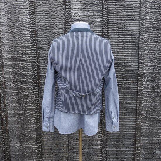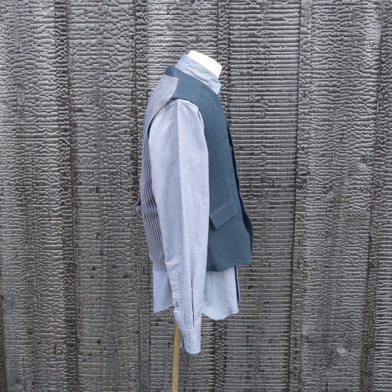 前身頃は麻100%(無地)、後身頃は綿100%(ピンストライプ柄)生地の切り返しによって仕立てられた2ポケット+1内ポケットのWaist Coatです。襟を持たないノーカラーで5つボタンのジレとも言え、ウエストのアジャストベルトを上手くデザインに盛り込み、当ブランドらしい良質な生地感とデザイン性に優れたシンプルなWaist Coatはポケットなしのシャツなどに合わせスッキリと着こなしてもいただけるのです。