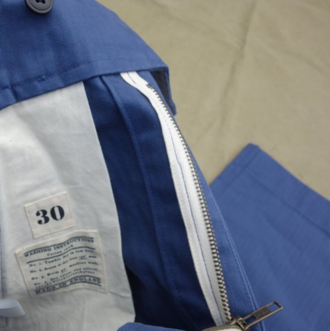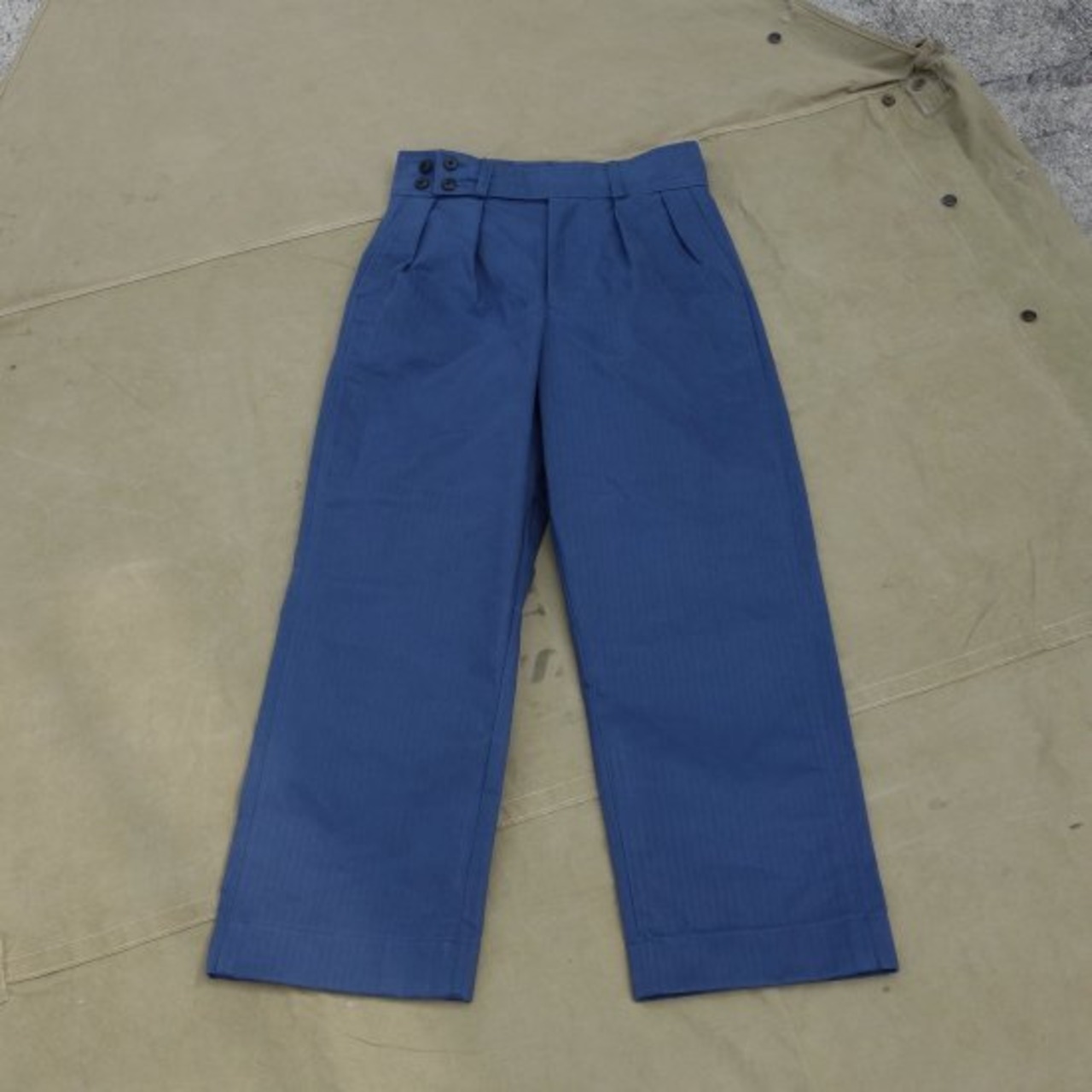 1957年頃にサヴィルロウのGieves and Hawkesで仕立てられた英国軍士官用トラウザーがデザインソースです。スコットランドの機屋でタイトに織り上げたヘリンボーンコットンで仕立てられています。やや裾に向かってテーパードの効いた4プリーツタイプのトラウザーで、内側ボタンを留め、ジッパーフライを上げ、さらにベルトループの右側にセットされたボタンで1段階ウエストの調整が可能です。ヘビーコットンヘリンボーンの生地は初め硬さはありますが徐々に体に馴染み、着込めば着込むほどアタリが生じ経年変化と風合いが増し、末長く愛用できるアイテムとして楽しみいただけます。"Chinwest JK Herringbone"とセットアップでもお楽しみいただけます。