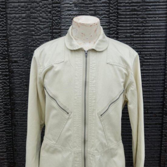 襟の形はラウンドカラーで、両肩にはガゼットが当てられ、前身頃は首元~股までジッパー開閉でき、ウエスト身幅はスナップボタンで二段階調整が可能で、袖口はスナップボタンで一段階絞って調整でき、裾の前側にはジッパーが設けられ裾幅を調整することができます。ジッパー付きのポケットが胸の左右に二つ、腰部付近の両サイドに二つ、両側のひざ下の外側のみスナップボタンポケットの全部で6個のポケットが用意されています。
