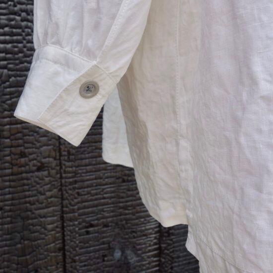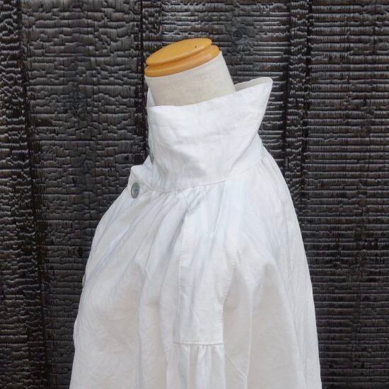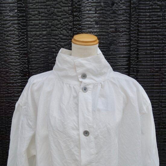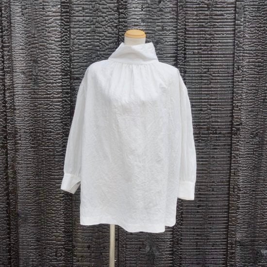 1940~50年代頃、ヨーロッパの羊飼いたちが着ていたプルオーバーのスモック。細かなギャザーがたっぷりと施されボリュームあるシルエットや、当時のスモックやブラウスに多く見られる肩に配された三角形のガゼット(画像7番目)。ボタンの配された背面を前身頃にして着用できるデザイン。これら全てヴィンテージに残るそのディテールひとつひとつを丁寧に再現しています。