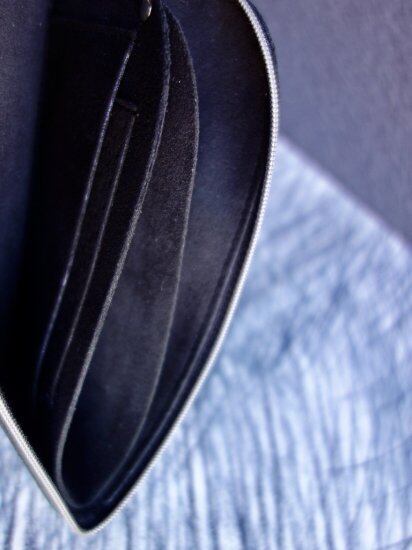 マイクロファイバー「ウルトラスエード」を用いたSE1-USの進化版のLジップロングウォレットです。前面にパンチング加工されたカードポケットがセットされています。内部にはオープンコインポケットが1つあり、それを挟むように両面に配された3+1枚入るカードケースとマルチポケットも備わっております。こちらのタイプはお札は折らずに収納ができる「ご家庭で洗える財布」になります。