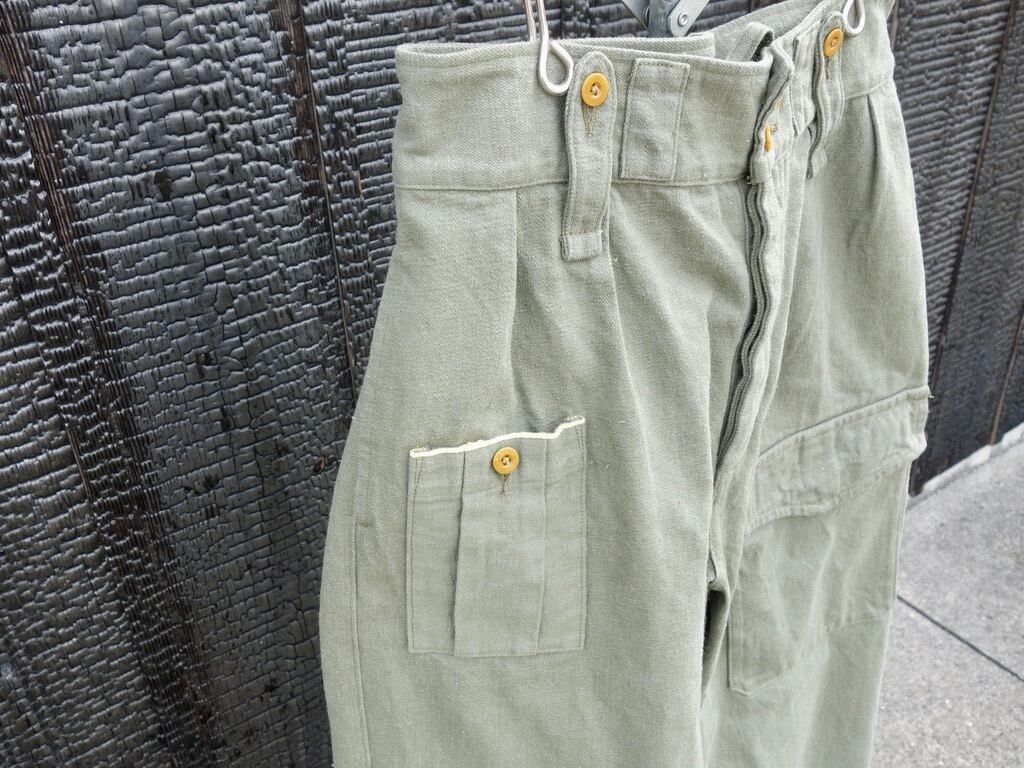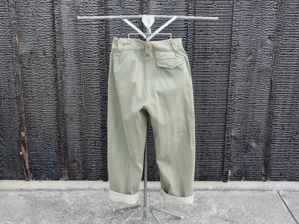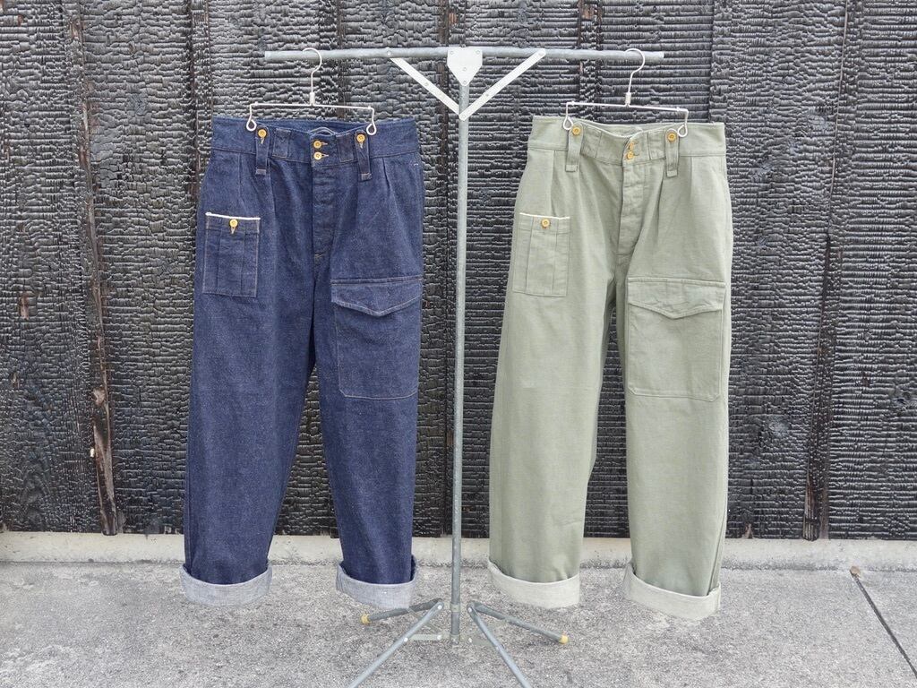1940年代のブリティッシュ・アーミーのバトルドレスパンツをベースに1960年代のローデシア軍のバトルドレスパンツの要素をドッキングさせ、日本の生活様式に合うようにアレンジしました。 特徴的なのはベルトループ。本来はピストルベルト用とされていたベルトループの向きを逆にして、より使いやすく機能的に変換しています。またベルト裏の仕様は1940年代のオフィサーズパンツの仕立てを分析し採用することによって、デザイン元はファティーグパンツの域でしたがオフィサーパンツの域まで昇格し価値転換しています。