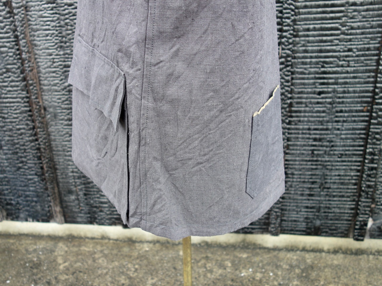 第1次大戦の英国陸軍で運用されたヴィンテージのジャーキンベストをベースにし、ヘンプキャンバス素材で現代に蘇らせました。第1次大戦ごろまでは航空機が戦場に投入されることはあったものの偵察が主な任務であり空対地の攻撃などにはほとんど用をなしませんでした。戦闘は地上戦に限定され敵の火線から身を守るために塹壕が多様されました。むき出しの岩盤や土壌に囲まれた環境で体を守るために最外殻に着用した頑丈なレザー製のベストがオリジナルです。謂わばボディーアーマーの役割ですが、当然銃弾を止めたり軽減したりする力はありません。しかし、レザーは通常人が身に着ける材料の中ではとても頑丈な性質を持つので過酷な塹壕内では良く機能しました。あまり知られていませんが、レザーは火に対して強く焦げることはあっても着火したり燃え広がる事はありません。 高速で走破する陸上兵器や地上攻撃が可能な航空機の出現により塹壕は次第にその価値を失います。ジャーキンベストもまた陸軍の装備品から姿を消しますが、英国の官給品ワークウェアのごく一部として貴重なヴィンテージとしてその名残が残っています。