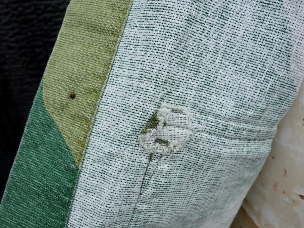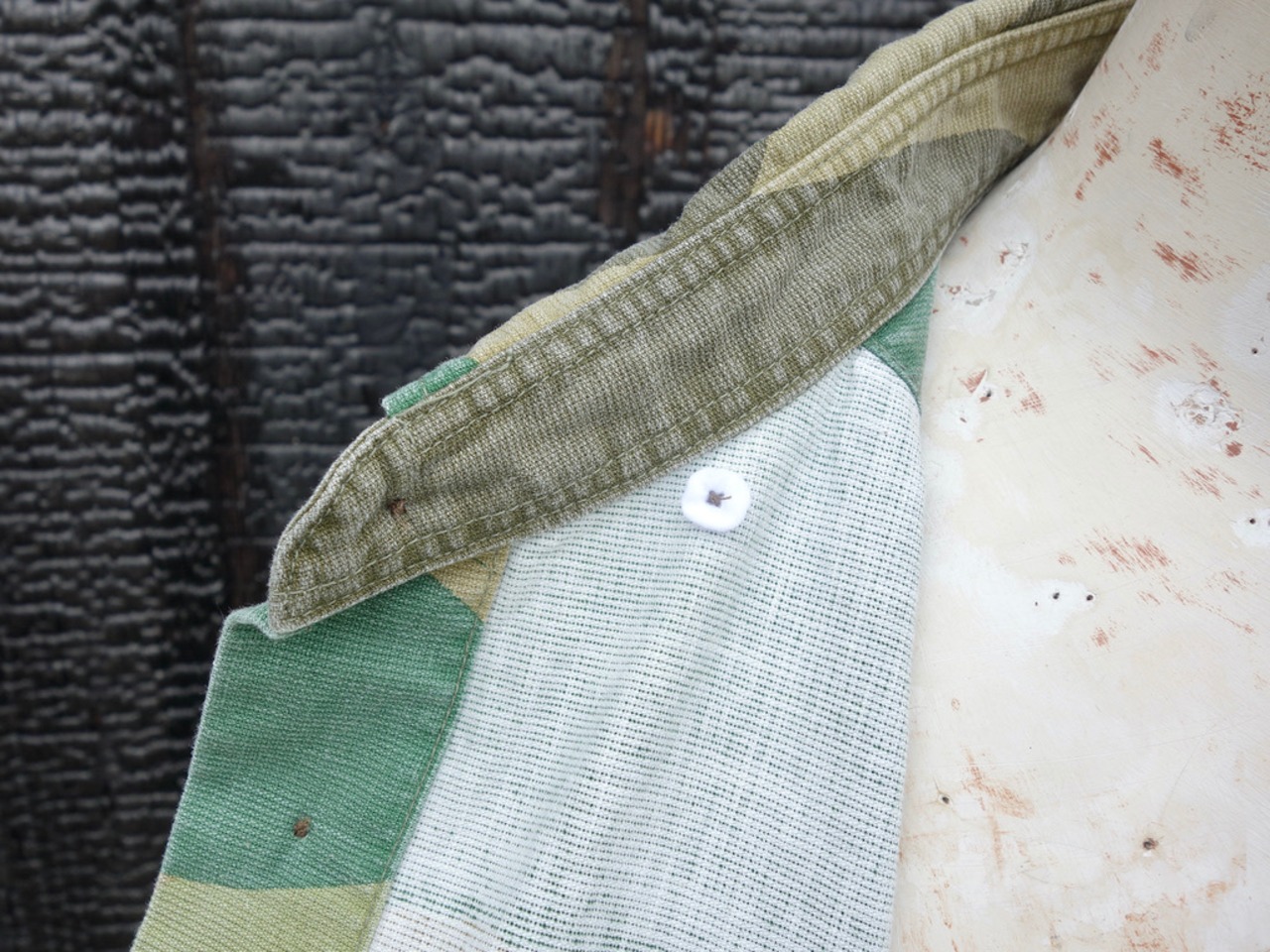 パナマクロスのワークシャツ。 パナマクロスは英国陸軍が熱帯や亜熱帯で多用した、通気性に優れ且つ頑丈なファブリックです。通気性を確保するために目の粗い平織り組織となっています。平織りは引き裂きに弱いというデメリットを持つので、それをカバーするためにタテヨコ共に数本以上を引きそろえた所謂斜子(ななこ)とすることで、通気性と引き裂き強度を両立させています。